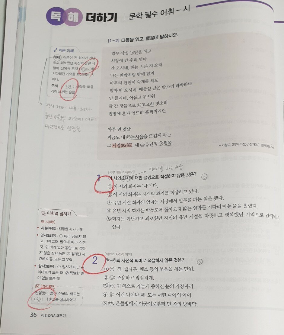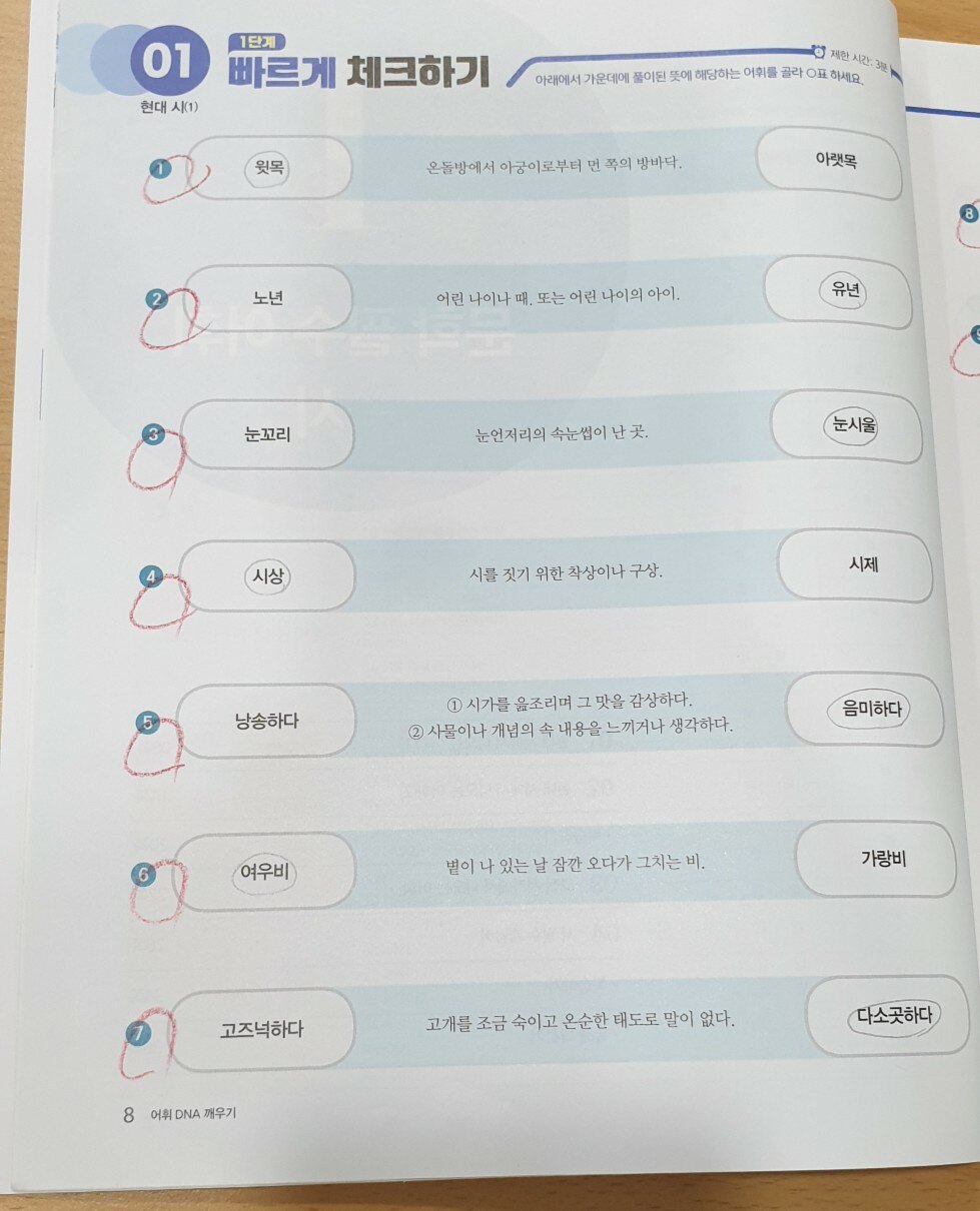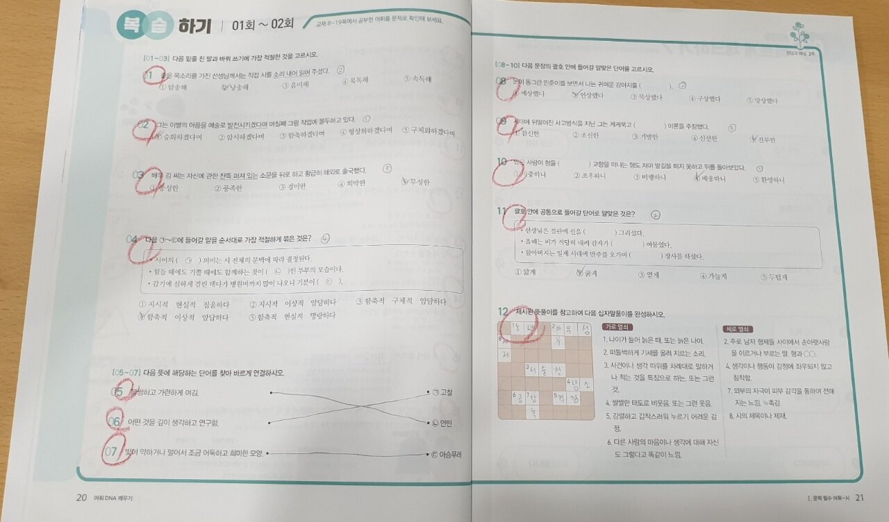 우리 아이들이 공부하는 과목 중에 단연 중요시 떠오르는 과목은 수학도 영어도 아니고 국어라는 사실~ 많이들 실감하실 거예요. 국.영.수.사.과 할 것없이 출제되는 문제들의 개념 수준이 날로 높아지고 문맥을 정확하게 이해하기 위해서는 어휘 공부가 초석이 되어야만 합니다. 천재교육에서 출간한 "어휘DNA깨우기 기본편"은 중1~2학년이 공부해야 할 필수 어휘(732개)를 간단하고 재밌게 공부할 수 있게 구성한 중학 국어의 해법서라고 할 수 있지요. "어휘 DNA 깨우기 기본편" [특징] 퀴즈로 쉽고 재미있게 (3단계 학습법) 하루10분,28일 완성(732개 어휘를 짧고 굵게 학습) 다양한 독해 지문 (독해력,국어력 향상) [구성] ●1단계 빠르게 체크하기 중1~2학년 9종교과서에 나오는 필수 어휘와 필수 개념어를 퀴즈로 구성 ㅡ반의어, 동일 한자가 사용된 어휘, 헷갈릴 만한 어휘가 오답으로 제시되는데 이 중에 빠르게 답 찾기 해봐요 ●2단계 꼼꼼히 확인하기 1단계의 정답을 확인 오답과 비교하면서 어휘 학습 확실히!! ㅡ1단계 퀴즈의 정답이 초록색으로 표시되어 있네요. 오답의 어휘와 뜻풀이까지 꼼꼼하게 공부할 수 있지요. ●3단계 문맥으로 소화하기 주어진 문장의 빈칸에 들어갈 알맞은 어휘 써넣기 ㅡ빈칸에 알맞은 어휘를 보기에서 찾아 써보기합니다. ●복습하기 다양한 유형의 확인문제로 배운 어휘 복습 퍼즐,사다리타기등으로 재미나게~ ㅡ공부한 어휘를 다양한 유형의 문제로 확인해 봅니다. ●독해 더하기 학습한 어휘를 바탕으로 한 독해 문제 구성 ㅡ앞에서 배운 어휘가 실전 독해 문제에서 어떻게 출제되는지 예시 문제를 풀어봅니다. 수능 기출 유형으로 수능 대비까지 가즈아~^^ [차례] 대표적인 문학 장르인 시와 소설의 필수어휘 / 비문학 필수 어휘 / 문법 필수 개념어& 어법 / 관용표현(한자성어,관용어) <어휘 28일 완성 계획표> 나누어진 소단원을 참고하여 학습목표를 정하고 공부하면 부담스럽지 않게 완북 성공 할 거 같아요~ [정답과 해설] 정답은 찾기 쉽게 박스권에~ 그 아래로 설명과 오답풀이가 상세히 적혀있어 지문 이해는 완벽히! 틀린 부분은 제대로 ! < 이런 친구들에게 추천해요!!! > -초등어휘 끝내고 중등 과정 입문하려는 친구들 -예비중학생부터 중학 1~2학년까지 -중등 어휘 확실히 잡고 가고 싶은 친구들 -혼공으로/자습으로 국어 공부하는 친구들 -독해 실력이 안 올라 고민하는 친구들 [총 평] 어휘 공부는 자칫 지루해 지기 쉬운 공부인데요~ "어휘 DNA 깨우기 기본편" 은 매일 10분 퀴즈로 쉽고 재밌게 학습 할 수 있는 구성이 아주 맘에 들었어요~ 정답과 오답의 어휘까지도 꼼꼼히 학습할 수 있게 정리가 잘 되어 있고 문맥에 맞게 빈칸 넣기,복습하기,독해 더하기 part까지 거치면 독해력 향상에 큰 도움이 될 거 같아요~ 특히 독해 더하기 part에서는 실전 독해 문제를 접할 수 있어서 엄청 유익하답니다. 중학 1학년 국어 어휘서로 강추!!! 어휘 DNA 깨우기 기본 편 다음은 ? 어휘 DNA 깨우기 실력 편 으로 실력 UP !!! [본교재는 천재교육으로부터 제공받아 직접 풀어보고 작성하는 솔직 후기입니다]