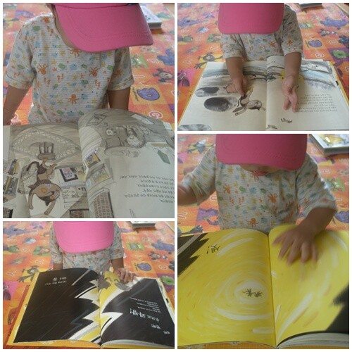 아이가 이제 두돌 넘어가면서 자기 감정을 표현하기 시작하고 자기 생각을 말하기 시작하는데 아직은 표현이 서툴려서 엄마가 그때그때 제대로 된 반응을 해주지 못해서인지 요즘 들어서 더 짜증이 늘고 모든 일을 울음으로만 해결하려고 해요. 그러니 엄마인 저도 아이의 마음을 헤아려주지 못해서 답답하기도 하면서 그런 아이에게 같이 짜증이 나서 같이 얼굴을 찌푸리고 큰소리를 내게 되네요. 이런 시기에 만나게 된 색깔 정서 그림책 ~ 깔깔깔 웃음이 번지는 노랑~ 이 책을 보는 순간만이라도 웃을 수 있기를 바라는 마음으로 책을 펼쳤어요. 비오는 장면에서 시작을 해서 흑백톤의 그림으로 첫장면을 맞이하게 되네요. 여기서 유독 눈에 띄이는 건 연우의 노랑풍선~ 가만보니 연우는 노랑머리핀에 노랑나비 그림의 옷을 입고 있어요. 비오는 날 유치원에 혼자 남게 된 연우는 해님에게 놀러가는 고양이를 따라나서요. 고양이는 연우앞에서 겁장이가 아닌 척 우쭐대지만 고양이도 알고 보니 역시나 겁장이네요. 해님의 재채기로 하늘이 찢어지면서 번개가 생기는거래요~ㅋㅋ 무서움을 이기고 해님에게 갔지만 해님이 늦게 왔다고 안 놀아줘서 둘은 어둠속에있게 되요. 무서움을 이기기위해 노래를 불러요. "나비야,나비야~" 고양이의 엉터리 노래에 웃음이 터진 연우를 따라서 그 웃음만큼 나비가 생겨나요. "나리 나리 개나리~"노래에는 병아리들이 모여들구요. 신나는 노래에 어느새 해님도 나와서 즐겁게 같이 놀아요. 이제 어둠이 무섭지 않은 연우는 처음보다 더 커지고 더 밝은 얼굴로 집으로 돌아가지요. 페이지가 지나갈수록 강조되는 노랑~ 고양이의 노랑 장화, 노랑 오리,번쩍 노랑 번개~ 알고 보면 우리 주위에 노란색이 참 많네요. 그러고 보면 유치원 아가들의 원복도 노랑색이 많은 듯해요. 노랑은 태양을 상징하는 색이라서 두려움을 없애는데 도움을 준대요. 노랑을 좋아하는 사람은 미래에 대한 희망이 가득한 긍정적인 사람이 많다고 하네요. 의식적으로라도 노랑을 좋아하도록 해야겠어요. 우리 아이도 더 밝고 긍정적이면서 즐거운 생각을 많이 하는 아이가 되기를 바라는 마음이 많은데 아무 노력도 하지 않고 그러기를 바라기보다는 노란색으로 그림그리기~ 노란색 많이 보여주기~ 이런걸 통해서도 마음을 바꿀수 있겟구나 하는 자신감을 갖게 되네요. 책을 보는 또다른 재미는 중간 중간에 노래를 부르도록 한다는 거여요. 책을 보다보면 자연스럽게 노래를 안 부를 수가 없거든요. 그래서 책 읽는 재미도 더 하고 노래하면 신나잖아요. 그러면서 긍정의 에너지가 더 나오지 않나 싶네요. 이 부분에서는 누구나 다 저절로 노래를 하지 않았을까 싶어요. 아직 나비야 노래를 혼자서는 못부르지만 엄마랑 같이 부르면서 따라하기는 잘하거든요.책속에 피어나는 많은 나비처럼 노래를 따라부르는 아이의 마음에도 나비처럼 환한 마음이 생겨났을거 같아요.