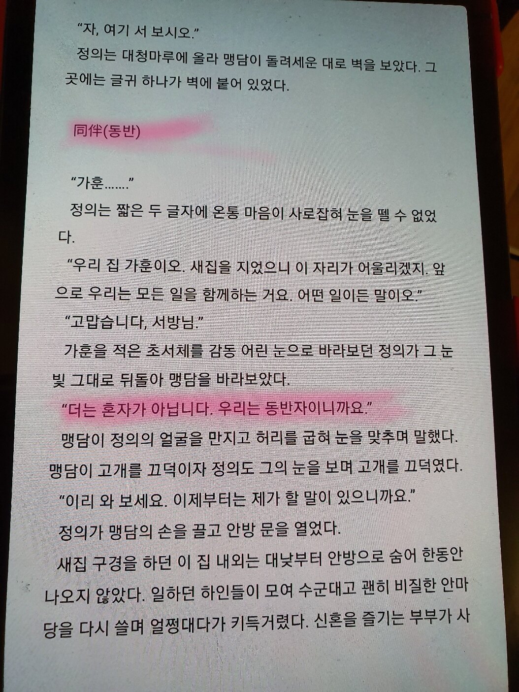 제목보고 질렀는데요 사놓고 4년을 묵혔네요.....(먼산)이유는 어음 표지?알고봤더니 마루야마 출판사거더라구요.....믿고 볼만한 출판사 이긴합니다.우선 초반글 읽을때 조금 힘들었네요~~로맨스 19금 소설인데 ㅠㅠ 초반부터 중반까지 글이 잘 안읽혀서 고생좀했네요.하지만 모든 의문이 풀리고 여러가지 장치들이 해소되는 중반이후에는 술술읽히더라고요 ㅋㅋㅋ로맨스가 등장하니 그때부터 집중력이 ㅋㅋㅋㅋ음 스릴러, 추리물에 가까운 소설이였어요.남주 안맹담(실존인물)과 세종의 딸 정의공주의 사랑이야기에 판타지물이 섞여 잘써진글이였다고 생각합니다.생각보다 작가님이 글쓰면서 고심한 흔적들이 보였달까요...특히 정의공주의 성격이 참 마음에 들었어요 ^^요즘은 이런 여주가 대세죠~여장부스퇄~~마지막 작가후기에 안맹담이라는 실존인물이라는 이야기에 허걱했죠 이름이 것참 ㅋㅋㅋㅋ그치만 소설속 안맹담이라는 남주는 참으로 멋진 사내였죠그런 사내이기에 정의공주도 마음을 열고 사랑하게 되었겠죠~~마지막 쳅터쯤에 안맹담이 가훈이라면서 동반이라는 글을 쓰고 아내에게 보여주며~~동반자라 더이상 혼자가 아니라는 말에 울컥했네요너무 적절한 말이라....내용과 너무 잘맞는 말이라작가님 다음작품 찾아서 읽어보고싶어지네요~~개인차는 있을거 같아요저는 재미있게 읽었어요~~~