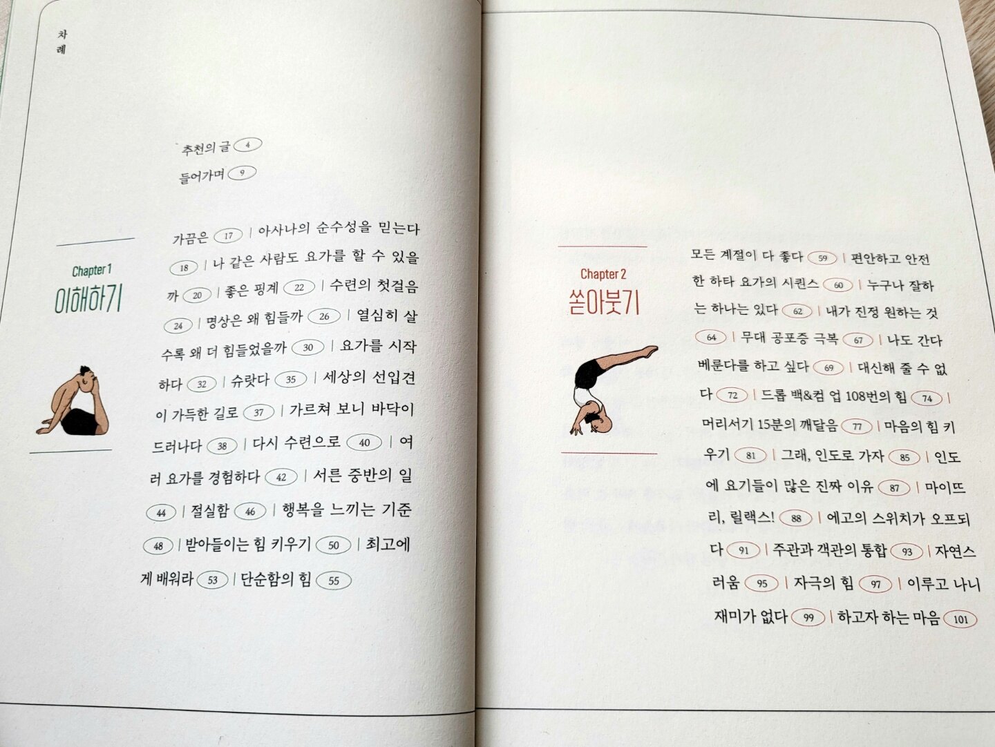 그간 단순히 동영상을 보고 들으며 따라하는 것에만 만족해 왔다면, 이 책을 읽는 동안 '요가수련(?)자' 로서 도외시했던 여러 기본용어들, 이를테면 아사나 (Asana, 요가 체위 또는 '요가 자세') 라든지 슈랏다(Shraddha, 요가를 하니 내게 유익할 것이다 하는 믿음) 와 같은 수많은 단어들에 호기심이 생기고 배우고 싶어진다. 실물 사진이 아닌 요기윤 님의 그림으로 표현된 수많은 요가 자세들에 ( 나에게는 꿈의 자세들 이지만) 언젠가 닿고 싶다는 바램도 생긴다. ( 그래서 사람은 역시 제대로 배워야 한다 )