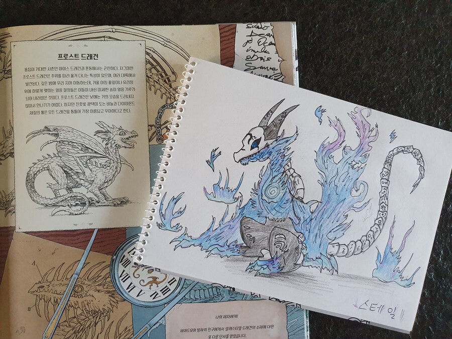 책 속 드래건을 보며 비슷한 듯 약간의 상상과 개성을 담아 따라 그리기도 하고