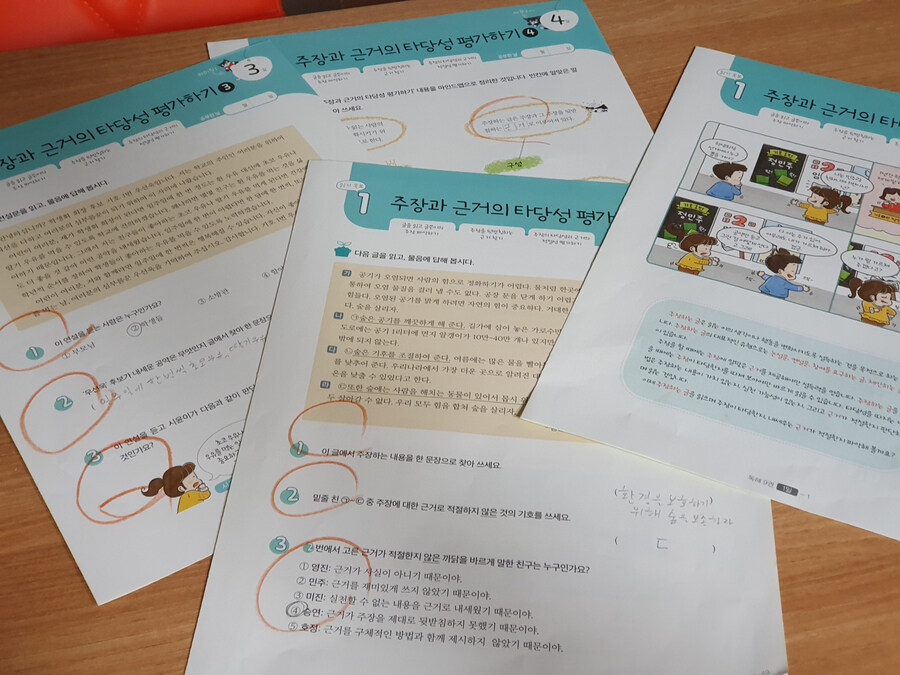 주장과 근거의 타당성 평가하기를 풀어가는 아들의 답안 보며