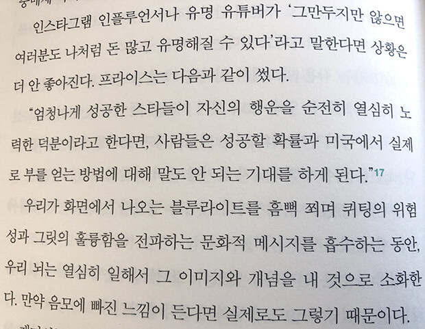 모든게 공개된 세상에서 인터넷 속사람들은 행복하고, 성공하고, 돈도 많은 것 같아서 자신도 그렇게 되고 싶기에 현실을 보지 않고 미디어 속 화려한 인생이 끌리게 되는 것 같다.