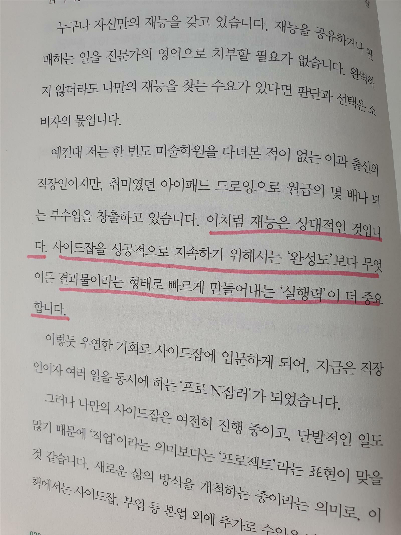 책을 보면서 요즘 인기있는 패시브 인컴 만들기 및 더 나아가 액티브 인컴 만들기까지 다양한 방법이 나와있어요. 클래스101 수업 및 프리랜서로 일하시고 크몽이나 텀블벅에서 일하는 것 까지 저도 이런 도전을 할 수 있을까 의문스럽기도 했습니다. 하지만 누군가는 도전해서 하고 있고 저같은 사람은 그저 구경만 할 따름이겠죠. 저도 놀고 있는 아이패드를 꺼내보려고 합니다. ^^ 그림 그리는 것을 좋아하거든요. 같이 그림 그리는 것을 좋아하면서도 다른 사람은 이렇게 자신의 그림으로 수익을 창출하고 있다는 것이 굉장히 자극적으로 다가왔습니다.