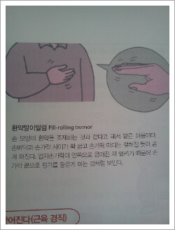 파킨슨병은 이제 낯설지 않은 질환이다. 유명한 권투였던 알리가 이 병을 앓고 있는 것으로 알려져있다. 흑질에서 만들어지는 도파민의 양이 급격하게 부족하게 되면서 생기는 것으로 알려져있는 파킨슨병. 프리랜서 아나운서인 김성주씨의 아버지도 파킨슨병 진단을 받았다는 사실을 방송을 통해 말하면서 매우 슬퍼했던 그의 모습은 나에게는 남의 일같이 느껴지지 않았다. 우리 친정아버지도 그와 비슷한 증상을 보였기때문이었다. 예전부터 필체가 좋으신 아버지의 글씨가 삐뚤하게 쓰여지고, 수저를 드시는 오른손이 떠는 모습을 보면서 나 역시 가슴이 아팠으니까말이다. 나는 아버지의 손을 유심히 보았다. 책에 나왔있듯이 파킨슨 3대 증상 중 하나가 손발의 떨림이고 특히 손 모양이 마치 환약을 조제하는 것 같은 환약말이떨림이 공통적으로 나타나는 증상이기때문이다. 다행이 책에서 본 손 모양이 아니라서 다소 걱정은 놓였지만 다른 질환이 의심되어 꼭 병원을 방문토록 말씀드렸다.