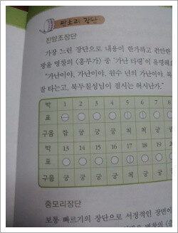 이 책의 색다른 점은 글에 판소리 장단을 넣어 판소리로 부를 수 있도록 만들었다는 점입니다. 사실 청소년들은 우리의 판소리보다는 서양의 음계에 더 익숙합니다. 그렇다보니 판소리에 나오는 장단들 즉 진양조, 중모리, 중중모리, 자진모리, 휘모리 장단이 어떤 장면에 나와야하는지, 각 장단의 북 치는 방법이 어떠한지를 잘 모릅니다. 이는 아마 어른들도 마찬가지가 아닐까요? 저는 개인적으로 사물놀이를 6개월간 배운 적이 있어서 장단에는 어느정도 익숙하지만 많은 청소년들은 아마도 귀에 익숙하지 않은 소리일 것입니다. 하지만 책을 읽다보면 각 장단이 어떤 상황과 장면에 나와야 하는지를 저절로 알게됩니다. 예를 들어 한가하고 편안한 장면에는 가장 느린 진양조 장단이 쓰이며, 춤추는 장면이나 활발하게 걷는 장면은 흥겨운 느낌이 나는 중중모리장단이, 상황이 매우 분주하게 벌어지는 장면에서는 매우 빠른 장단인 휘모리 장단이 쓰임을 알게됩니다.