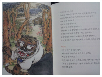 책을 읽기 전에 제목만 보았을 때 우리 전래동화 '해와 달 이야기'인줄 알았습니다. 엄마를 잡아먹은 호랑이를 피하여 하늘로 올라간 남매가 각기 해와 달이 되었다는 설화를 어렸을 적 한번쯤은 읽어본 적이 있을겁니다. 책 처음 부분에는 일하러 나간 어머니를 기다리던 오누이가 등장합니다. 그리고 오누이를 잡아먹기위해 호랑이가 오누이 엄마 흉내를 내는 부분이 '해와 달 이야기'와 비슷해 우리의 전래동화를 판소리 장단에 넣어 새롭게 꾸민 것으로 생각했지요. 그런데 읽다보니 내용면에서 훨씬 재미있게, 그리고 새로운 스토리로 전개되었습니다.