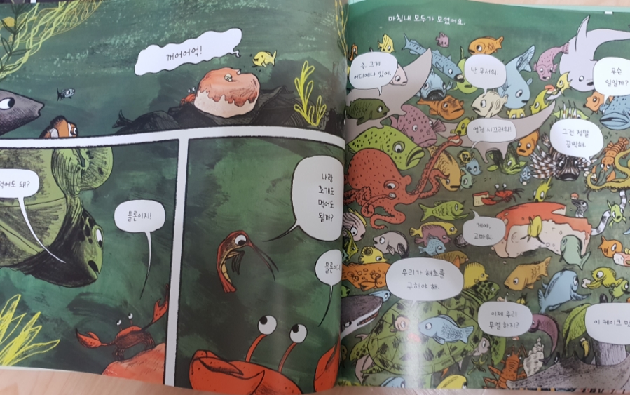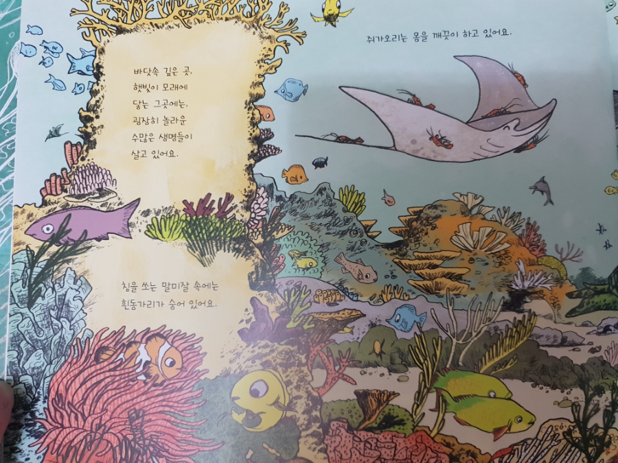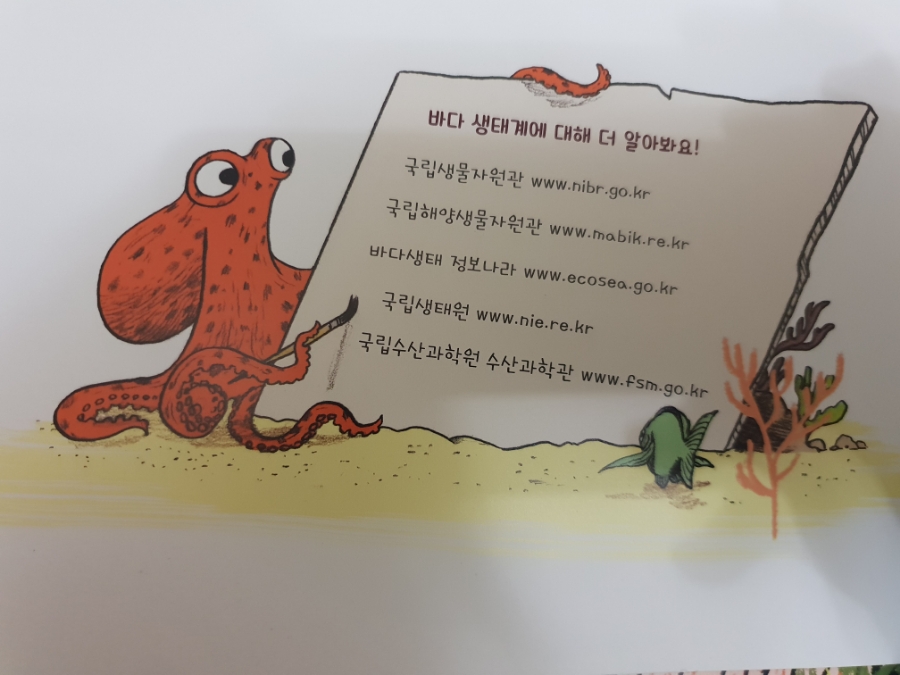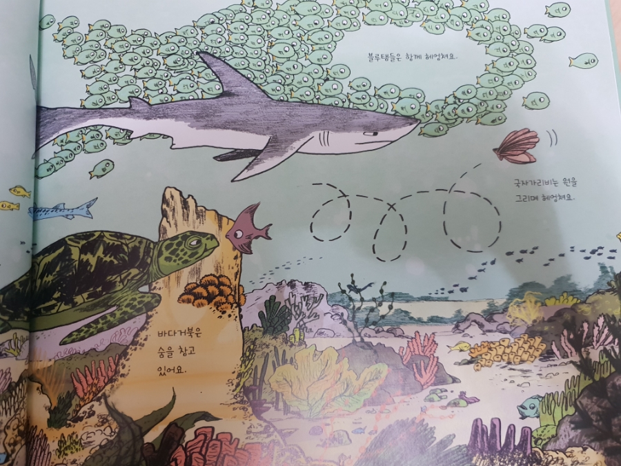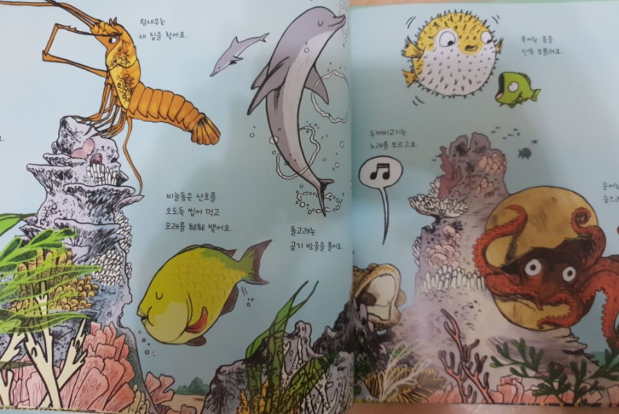 바다속 한 장면을 보여주며 여러 생물들의 이름과 함께 생태를 살짝 보여주고 있네요.
