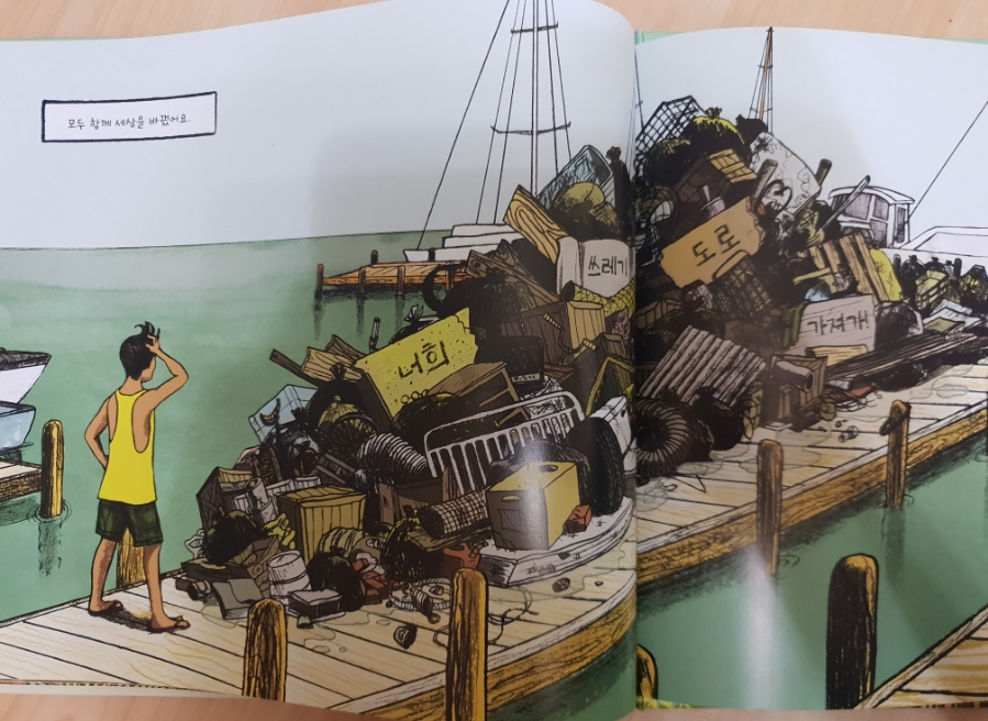 바닷속 친구들이 모두 힘을 합하여, 쓰레기를 다시 쌓아놓았습니다.