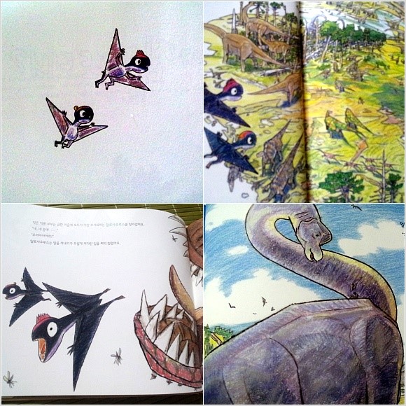 작은 익룡 부부를 잡아 먹을 생각을 하고 있었어요 작은 익룡 부부는 놀라서 멀리 날아갔어요