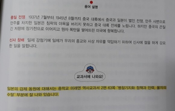 중학교 미래엔 역사교과서 2편 63쪽에 '병참기지화 정책과 인력, 물자의 수탈'
