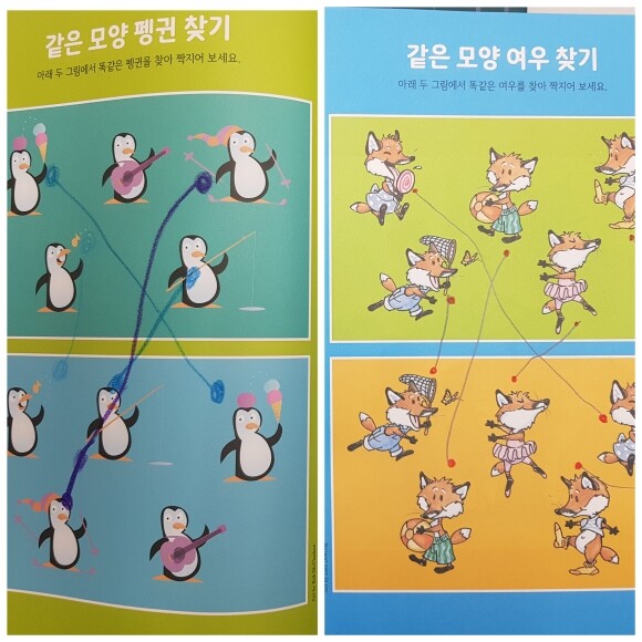 위 아래 두 그림을 보고 짝을 찾아주는 퍼즐인데 같은 그림 찾는거라서 금방 쭉쭉 연결시켰어요.