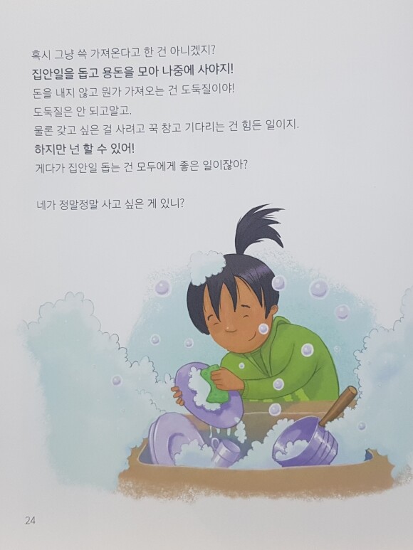 부모님이 함께 읽으며 내 아이가 무슨 생각을 하는지, 그렇게 판단하는 근거는 무엇인지 아이의 속마음을 들여다볼 수 있는 책이기도 합니다. 여러 가지 올바른 가치관을 구체적인 상황 속에서 알게 하는 것. 이 책이 만들어진 이유라고 합니다.