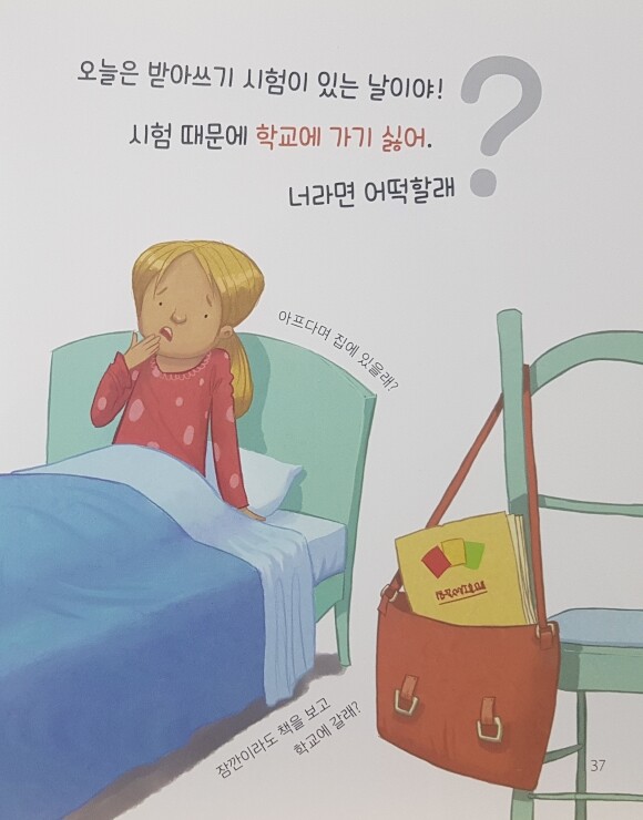 질문3] 오늘은 받아쓰기 시험이 있는 날이야! 시험 때문에 학교에 가기 싫어.