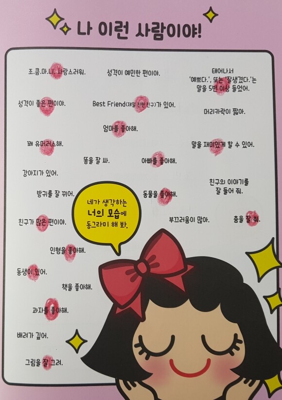 이 외에도 숨겨진 성격 파악하는 페이지, 엉뚱 고민 상담소 등 재미있는 내용들이 많이 들어있어요.