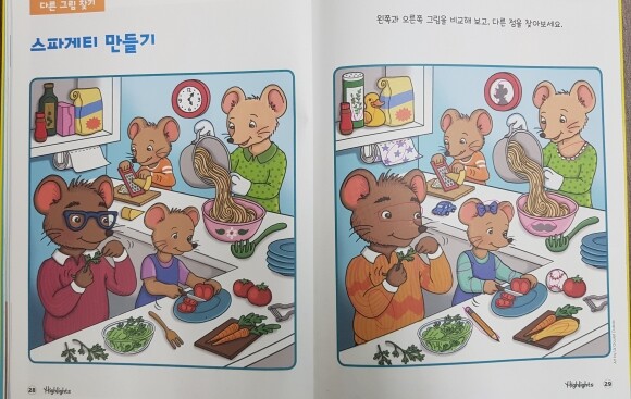 아이들의 일상생활 그림에서 서로 다른 그림 찾기입니다. 아이들은 그림 속 인물들의 표정, 옷차림, 작은 소품들이나 글자, 숫자의 모양이나 위치, 방향의 변화를 찾아내면서 관찰력과 기억력을 키울 수 있어요.