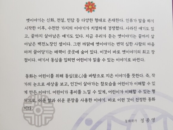 정종영 작가님은 옛이야기에 동심을 입히고, 인간이 사는 참모습을 현실적 상황에 맞게 보여주고,