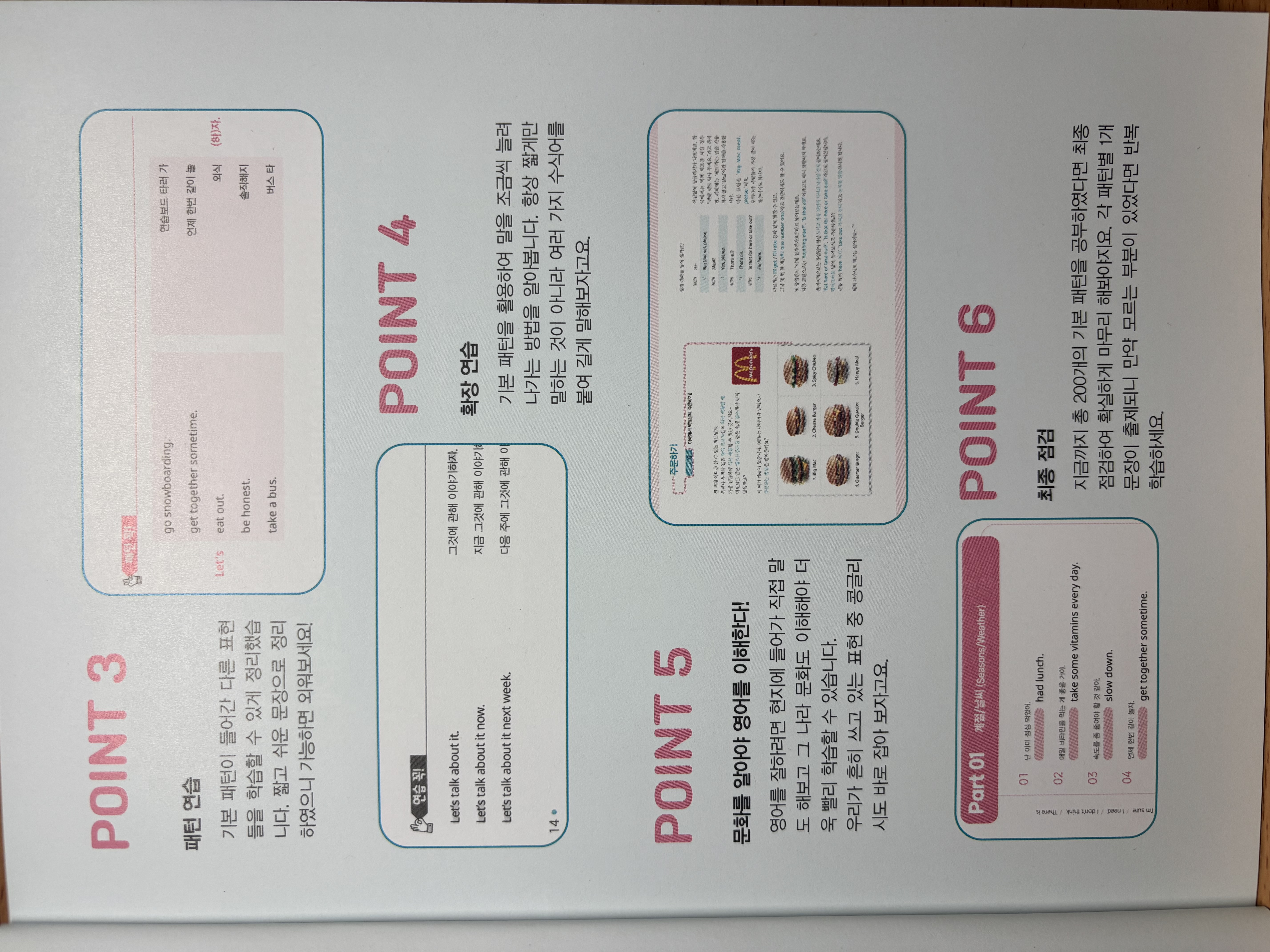 그날그날 주제에 따라 총 20DAY가 있으며, 하루에 10개의 내용으로 총 200개의 패턴을 알려주는 책입니다. 책에서 제공하는 mp3 틀어서 공부하면 10~15분 정도면 됩니다. 확실히 시험 영어에 비하면 내용이 쉽고 가벼워서 마음이 편하더군요. 사소한 습관의 힘에 나왔듯 거창한 노력보다는 하루에 15분의 꾸준한 노력이 정말 중요하다고 생각합니다.