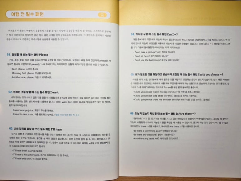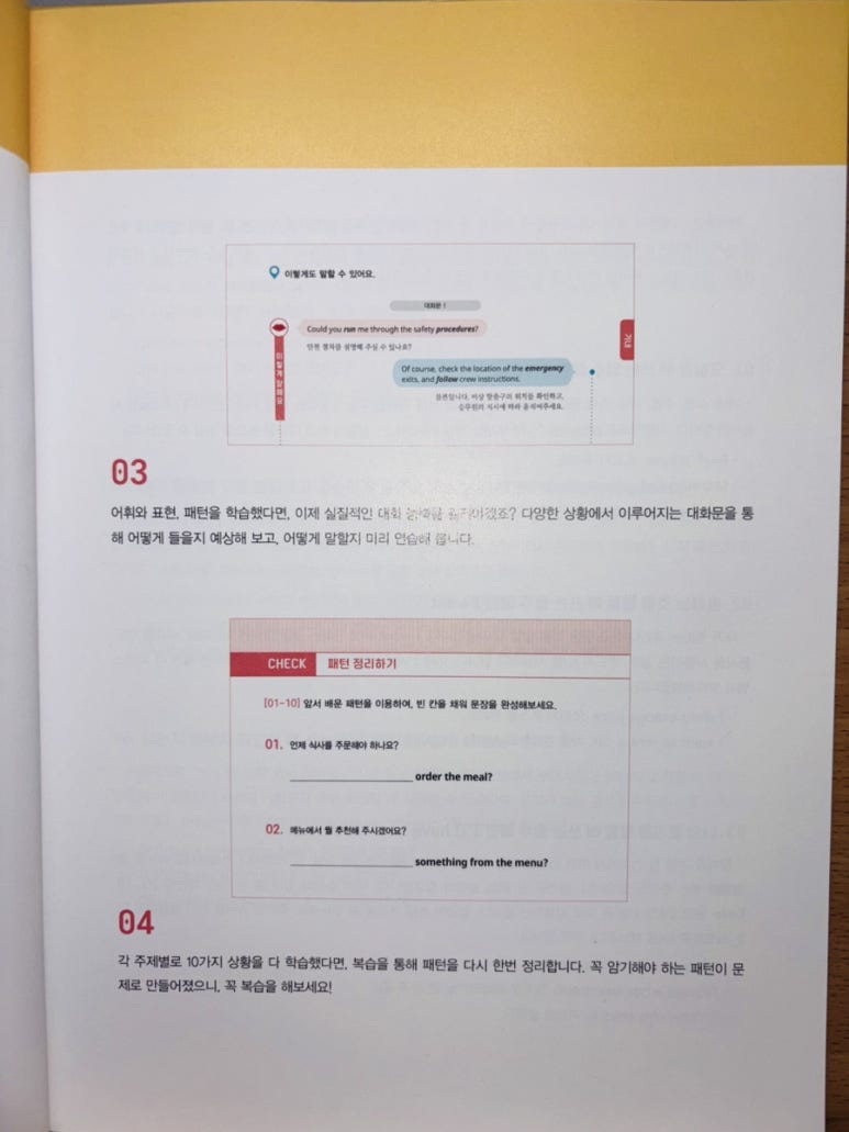 한국에서 비행기를 타면 비행기 안이죠. 혹시 외국회사가 운영하는 비행기일까봐 책은 기내에서 사용할 영어부터, 공항, 공항에서 내려서 교통수단, 호텔, 쇼핑, 식당, 관광지 순으로 여행의 모든 순간에 필요한 영어, 회화, 그외 여행시 필요한 언어팁들을 소개해줍니다. 각 장마다 패턴정리라고 해서 배웠던 것을 잊어먹지 않고 다시 복습할 수 있는 페이지도 준비되어 있고요.