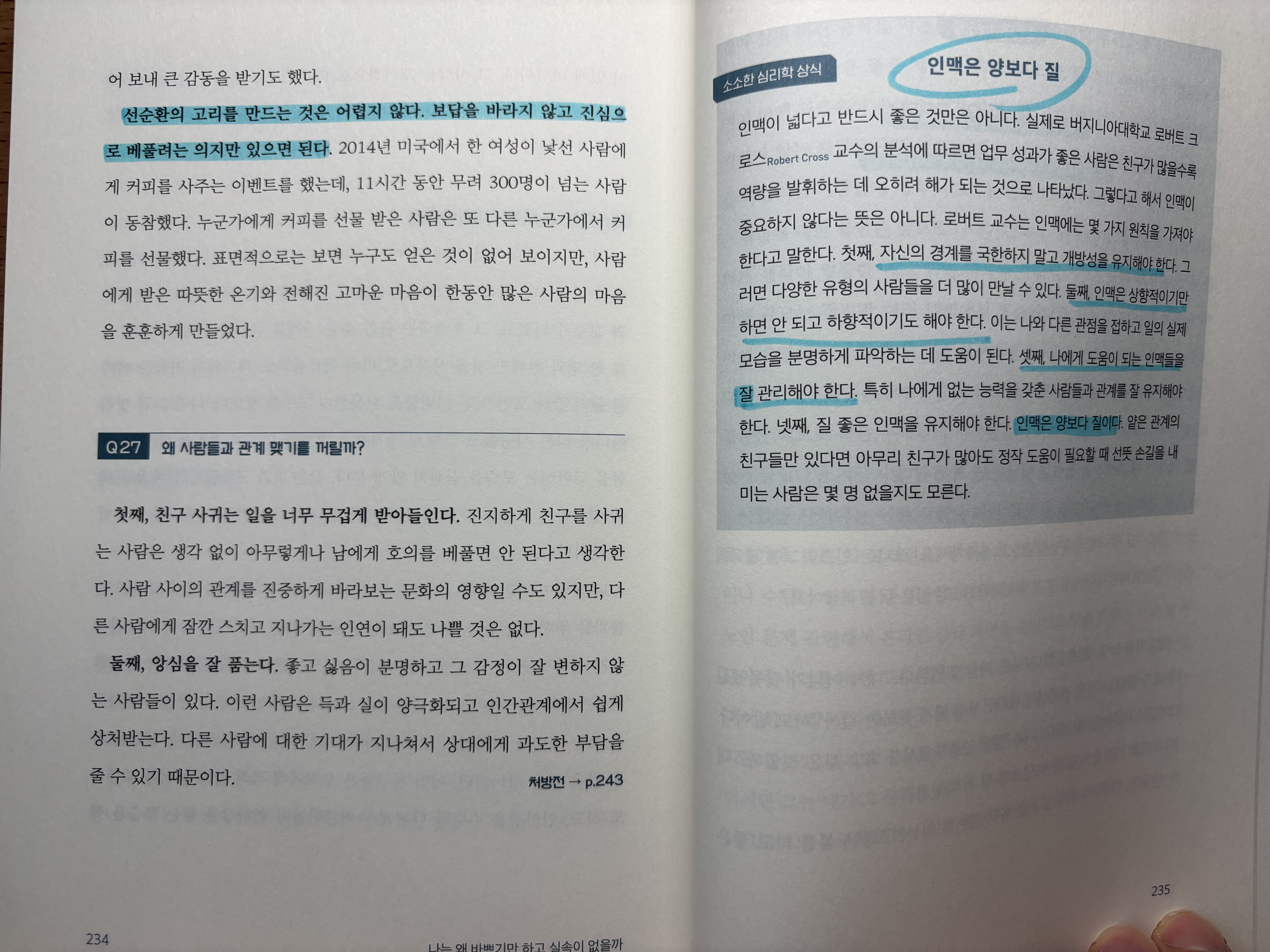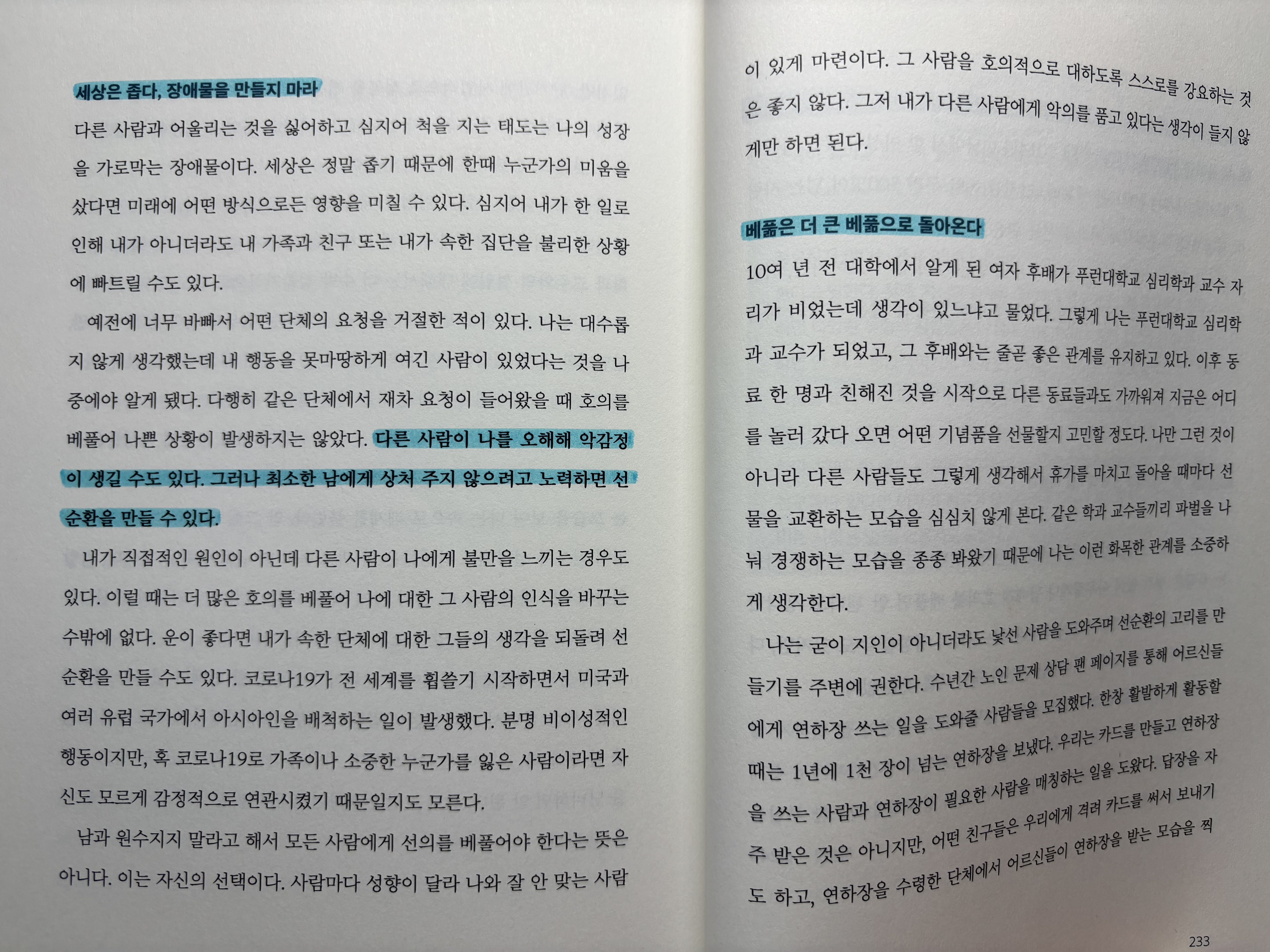 한 페이지, 한 페이지 밑줄을 다 쳐야한다고요? 형광펜을 들고 밑줄을 치려고 했는데 너무 좋은 내용들만 있어서 밑줄을 칠 필요성을 못 느꼈습니다. 책의 20프로 분량 정도만 화이트 테이프를 사서 지우는게 더 낫겠다는 생각이 들었습니다. 정말 심금을 울리는 문장들로 가득 차 있습니다.