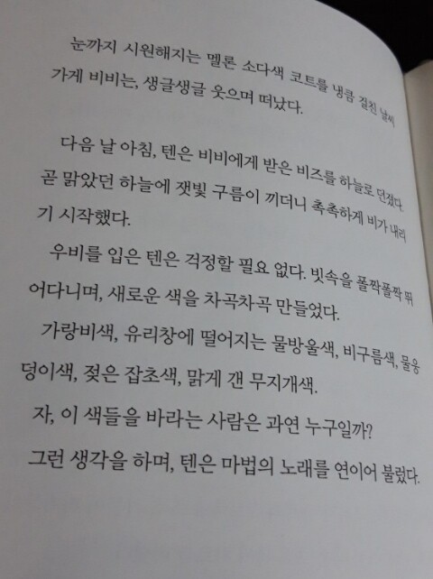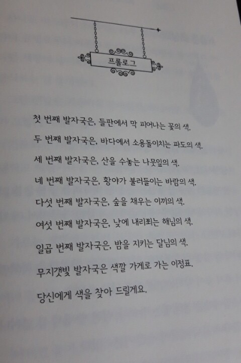이야기들도 너무 재미있는데다 소개되는 색들도 늦여름의 무지갯빛, 천 일째 포도주색, 여름 일 등으로 핀 해바라기색, 가랑비색, 유리창에 떨어지는 물방울색, 비구름색, 물웅덩이색, 젖은 잡초색 등 어쩜 이런 생각을 하였을까 싶을만큼 들으면 기분이 좋아지게 예쁘게 지었더라요.