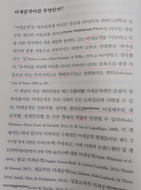또 이 개념이 인종차별뿐만 아니라 성차별, 젠더리즘, 이성애주의, 계급 차별, 장애인 차별 등 각종 형태의 억압과 연관될 수도 있다 하니 정말 도처에 미세 공격이 자리잡고 있네요.