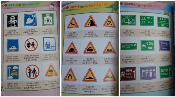 책의 구성은 다양한 표지판에 대한 재미있는 글과 그림이 주제별로 3장 정도씩 서술되어 있고 바로 뒷장에는 그 주제에 맞는 다양한 표지판들의 그림과 퀴즈가 한 단락으로 되어 있답니다.