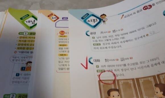 큰아이가 3학년 때 받아온 영어 교과서 본문 아래에 한글로 발음을 적자 혼을 내줬었다.