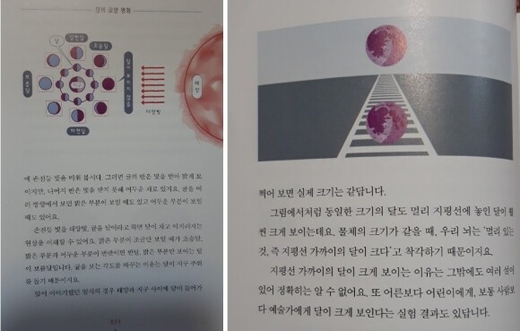 예를 들면 지평선 가까이의 달이 크게 보이는 이유에 대해 뇌의 착각의 설과 어른보다는 아이들에게, 보통 사람보다 예술가들에게 더 크게 보인다는 실험 결과도 있다고 소개해주니 복합적인 상상을 하게되며 미소가 절로 지어지더라고요.