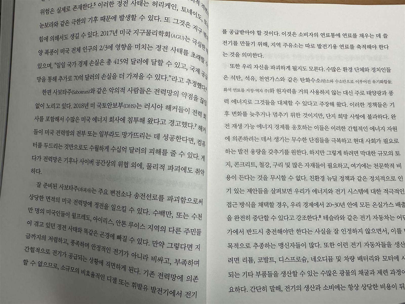 우리는 전기차의 시대에 살고 있습니다. 하지만 잠시 그 열풍이 주춤하고 있습니다. 왜냐하면 배터리화재도 문제지만 충전문제도 해결되지 않았고, 실제적으로 내연기관을 전기차가 모두 대체했을때, 전기사용량을 감당하지 못한다는 우려입니다. 저자도 재생에너지로 전기를 모두 감당한다는 건 착각이라고 강조합니다. 선진국들은 개발도상국에게 화석연료사용을 금지하는 것은 월권이라는 겁니다. 그래서 원자력에 대안이라는 저자의 생각은 생각해볼만하고 한국이 소형원자로의 강국이라는 점에서도 희망이 보입니다.