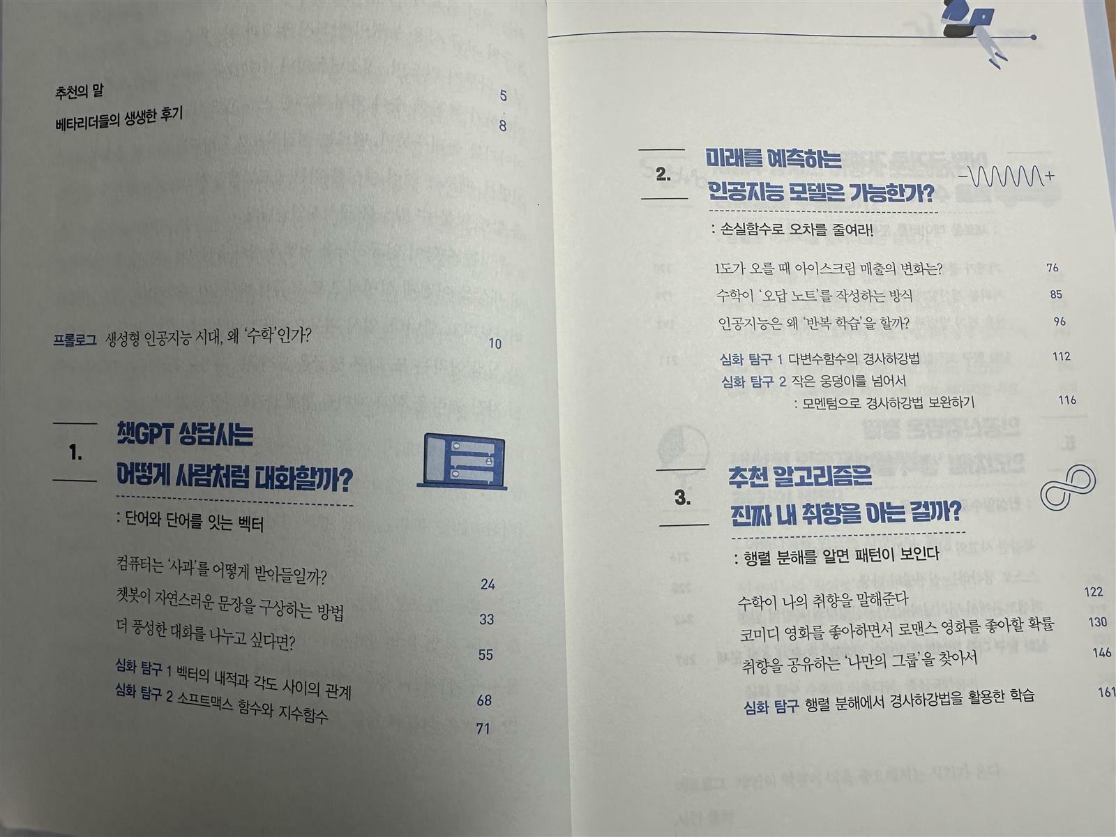 수학은 왜 배울까요. 사실 수학을 잘하면 좋은 대학을 나오고 좋은 직장에 들어가고 좋은 배우자도 만나고 많은 돈도 벌수있는 왕도죠. 하지만 많은 수학교사들은 고심을 하는 모양입니다. 수학이라는 것이 출세를 위한 등급같은 것이 되죠. 수학을 좋아하는 사람들이나 수학전공자들은 수학이 아름답다고 합니다. 하지만 사실 전체 인구의 80%는 별루 쓸데가 없죠. 너무 높이 잡았나요. 물론 맞는 말입니다. 하지만 수학은 인류발전의 기본이라는 겁니다. <AI가 쉬워지는 최소한의 수학>도 우리가 이제는 많이 사용하는 AI의 기초이고 제대로 인공지능을 이해하는 전문가가 되려면 수학은 필 수있니다. 물론 모든 사람이 수학을 잘할 필요는 없을 겁니다. 하지만 전문가의 끝판왕 지금 가장 핫한 AI전문가가 되기 위해서는 최소한의 수학이 필요합니다. 그것을 정리해줍니다. 연결하여 인공지능도 배웁니다.