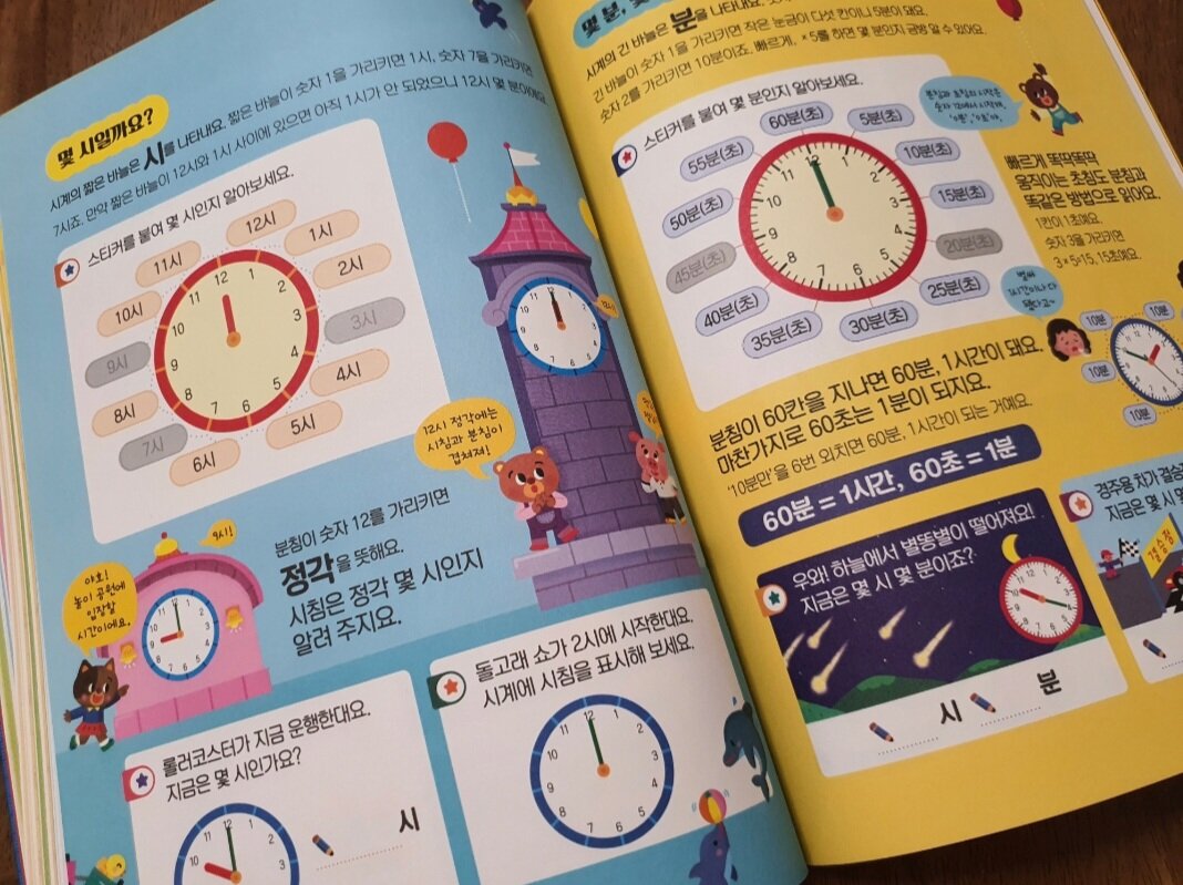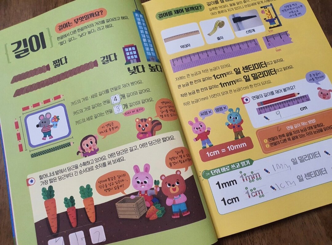 측정은 길이로 시작해 무게, 온도, 들이, 시간, 1년등 다양한 단위들도 진행이 되는데요. 알쏭달쏭 헷갈리는 단위들을 그림으로 비교하며 재미있는 놀이로 익힐 수 있습니다.