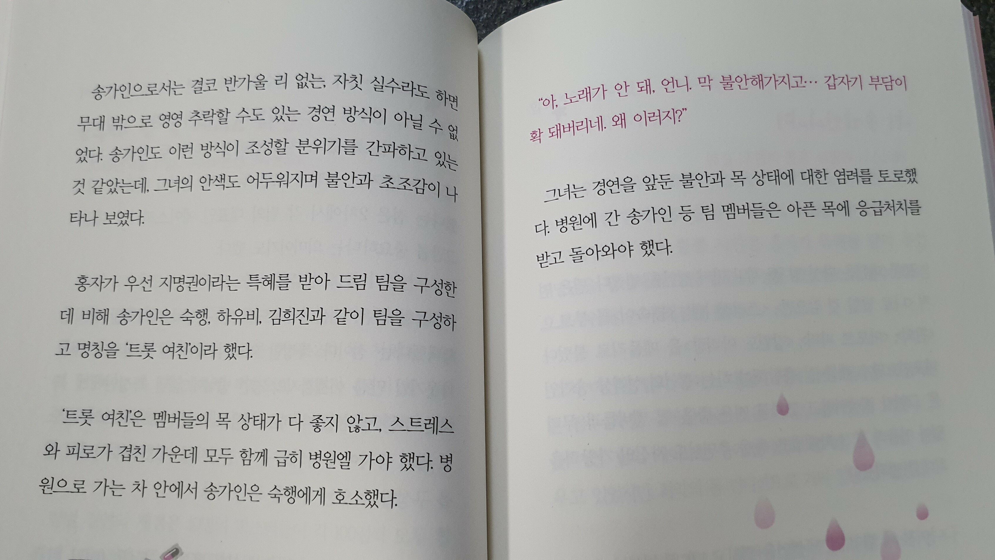 미스트롯을 통해서 대한민국의 트로트의 인기를 다시 정상으로 올려놓고 우리 나라의 최고 히로인이 된 송가인은 처음부터 인기있는 가수는 아니었습니다. 송가인은 무속인 어머님을 두고 국악과 판소리를 전공했었으며 트로트 가수가 된지 7~8년 동안은 거의 무명으로 생활했었습니다. 그러던 그녀가 내일은 미스 트롯 프로그램에서 두각을 나타낸 것은 그동안 갈고 닦아왔던 그녀의 준비기간 덕분이 아니었나 싶습니다. 작가의 말을 빌려서 말해본다면, 송가인 가수는 미스 트롯 프로그램을 통해 절정의 가창력을 보여줬을 뿐만 아니라 경연의 고비마다 독창적인 발상과 도전으로 극복해냈습니다. 또한, 송가인이라는 인물의 개인사가 미스 트롯을 통해 부각되고 무명가수에서 최정상에 오른다는 인생역전 스토리가 흥미진진 했습니다. 그리고 미스트롯이라는 프로그램 자체가 가진 매력적이고 중독성 있는 특징이 이 책에 담겨 있는데 저자는 일부 프로그램에 대한 비판도 서슴치 않고 있습니다. 때로는 심사위원의 개인적인 판단에 따라 좌우되었던 점 등이 포함되어 있습니다. 책의 제목인 반 소절 드라마라는 것은, 송가인 가수가 열창하는 트로트의 한 소절 아니 반 소절만 들어도 청중을 매료시키고 모두를 드라마속으로 빠져들게 하는 그녀를 의미하는 듯 합니다. 또한 반 소절의 트로트만으로도 자신의 무명시절을 모두 잊게 만드는 송가인 가수만의 인생역전 스토리를 의미하는 것 같습니다. 이 책은 송가인을 사랑하고 트로트를 좋아하는 저자가 본 송가인 가수에 대한 이야기이며, 미스 트론 프로그램에 대해 처음부터 끝까지 시청한 애청자의 이야기입니다 작가로부터 제공받고 솔직하게 쓴 글입니다