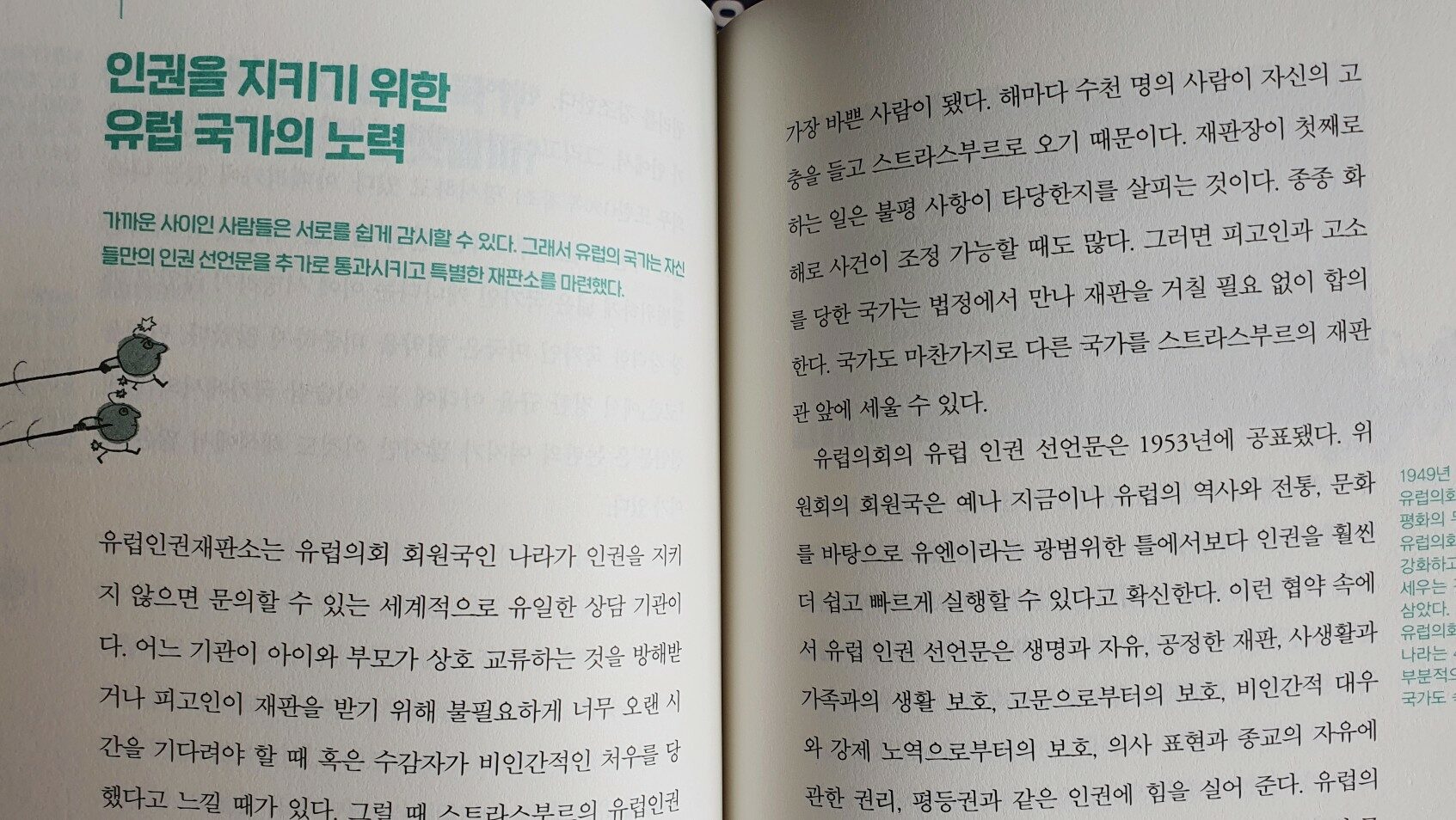 이 책에서 다루는 주제는 법, 국가, 정치, 민주주의, 권리와 책임, 존엄성 등이므로 상당히 무겁고 어려운 주제일 수 있습니다만, 독자가 청소년이기때문에 되도록 쉽고 이해하기 용이하도록 구성했습니다. 우선 실제 존재하는 사진과 삽화를 많이 포함시켰고, 중학교 교과과목에서 다룰 주제들과 연관성도 많은 것으로 보입니다. 아이들이 평소에 독서를 좋아하는 경우라면 더욱 관심있게 볼만한 책입니다. 민주주의가 어떻게 탄생했고 그를 위해 희생하고 노력했던 역사를 소개하는 부분에서 세계사와 연결되어 있기 때문입니다. 그리고 책의 6장에서 소개하는 현재 세계에서 움직이는 NGO 단체들의 이야기는 아이들의 꿈을 그릴 수 있게 합니다. 다양한 단체들이 인간의 인권과 민주주의를 위해 노력하는 이야기는 청소년이 미래에 새로운 꿈을 꿀 수 있는 여지를 줍니다.