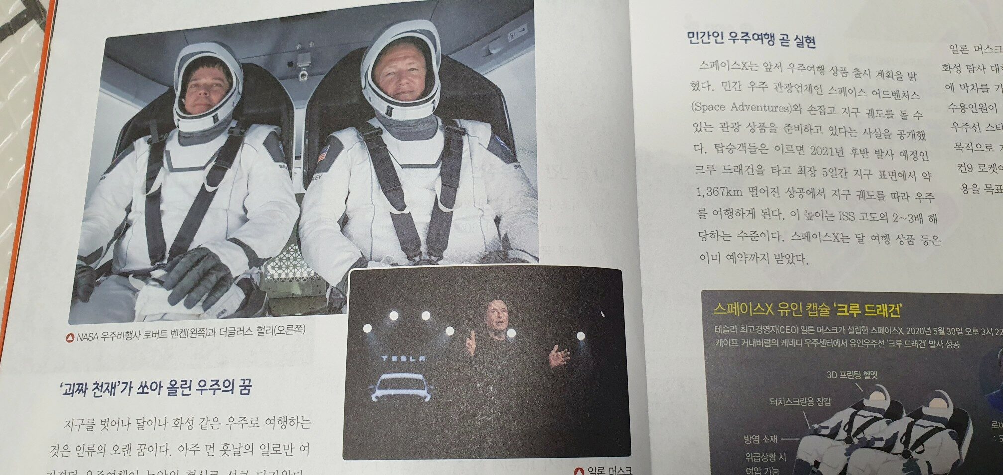 최신이슈및상식 7월호의 TOP ISSUE는 일론머스크의 스페이스X가 성공적으로 쏘아올린 민간 유인우주선의 이야기입니다. 한 번의 연기끝에 세계최초로 민간 유인우주선의 시대를 성공적으로 열게 된 이 사건은 역시 일론머스크라는 찬사와 함께 새로운 혁신이란 무엇인가를 알게해준 사건이었습니다. 그리고 두 번째 TOP ISSUE는 사드장비 반입에 대한 이슈이고 항상 국방과 관련된 이슈에는 함께 나오는 의혹과 또 의혹에 대한 이야기입니다. 그리고 정치외교에서는 미국 트럼프의 G7 초청 이슈가 논란이 되고 있습니다. 트럼프가 G7을 초청한 것은 러시아, 중국, 일본과의 첨예한 갈등요소가 짙게 베어있는 문제이므로 각 국가들간의 이해관계를 이해하는데 도움이 되는 주제입니다. 그 이외에는 6.17 부동산대책, 코로나19의 영향, 기본소득제 이슈, 일본의 마작스캔들, 자율주행드론 기술에 대해서도 설명하고 있습니다