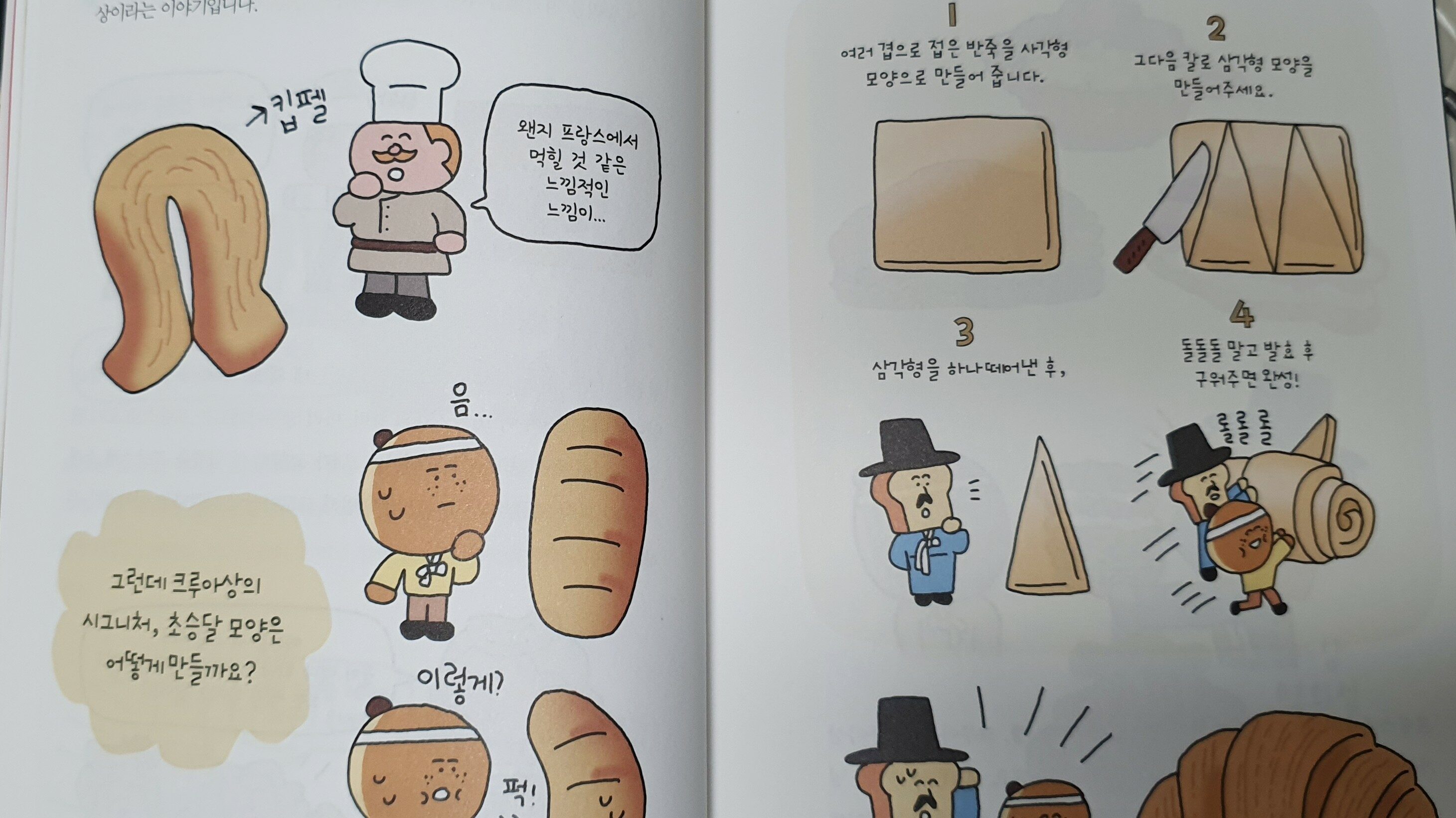 크루아상은 옛날에 마리앙투아네트가 오스트리아에서 프랑스로 가져온 다음에 확산이 되었다는 소문이 있습니다. 또는, 오스만제국이 오스트리아로 쳐들어 갈 때 이를 미리 알아챈 제빵사가 알려주어 오스만제국의 침공을 성공적으로 막게 되고 그 공로로 국기 모양의 빵을 만들게 됐다는 말도 있습니다. 여하튼 크루아상은 너무너무너무너무 맛있고, 초코크루아상, 버터크루아상 뭐든 다 고소하고 커피랑 먹으면 완전 꿀맛입니다. 빵선비는 팥쇠와 함께 그 이후에 스콘과 도넛, 식빵, 앙버터 등을 탐험아닌 탐험하면서 서울의 유명 빵집을 다 소개해줍니다. 그 중에서 제가 가장 좋아하는 건 바로바로 앙버터, 아직도 앙버터를 모르시는 분이 있다면 그것은 아직 빵트렌드의 ㅂ자로 못 따라가신것! 입니다. 앙버터의 앙은 팥앙금에서 유래된 것이고 예상하듯이 1800년대 일본에서 유래되었습니다. 서양사람들이 버터를 빵에 먹는 것과 일본에서 팥앙금을 먹는 것을 잘 혼합하여 일본에서 처음 만든 앙버터는 지금 서울에서는 가장 핫한 빵입니다. 저도 그 특유의 고소하고 달콤하면서 식감이 착 붙는 앙버터를 넘 좋아하고 커피랑도 최고로 잘 어울린다고 생각합니다. 이렇게 이 책에서는 식빵부터 도넛, 크루아상, 스콘, 앙버터 등 주요 빵들의 역사와 유래를 집어주고 서울의 가장 핫하고 트랜디한 빵집을 소개해주는 실용적인 감성에세이입니다. 일단, 엄청 재미있습니다.