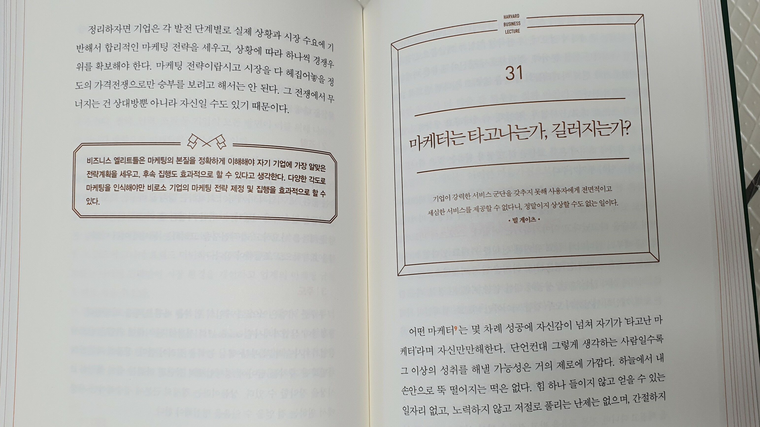 하버드의 공개강의를 분석하고 연구하며 하버드 졸업생들이 비즈니스 전략을 연구하는 기관인 하버드 공개강의 연구회에서 하버드 비즈니스 전략서가 출간됐습니다. 이 책에는 하버드대학교와 하버드경영전문대학원 출신의 졸업생들과 경영자들의 비즈니스 전략을 담았습니다. 포드, 델, 애플, 아마존, 마이크로소프트 등 굴지의 기업들에 대한 사례도 담겨있고 각 챕터별로 빌게이츠 등이 남긴 전략에 대한 명언들이 가득 가득 담겨 있습니다. 이 책을 한문장으로 정의한다면, 하버드를 연구한 전문가들이 하버드 출신의 최고위 경영자들의 비즈니스 전략을 설명한 비즈니스맨들을 위한 지침서입니다.