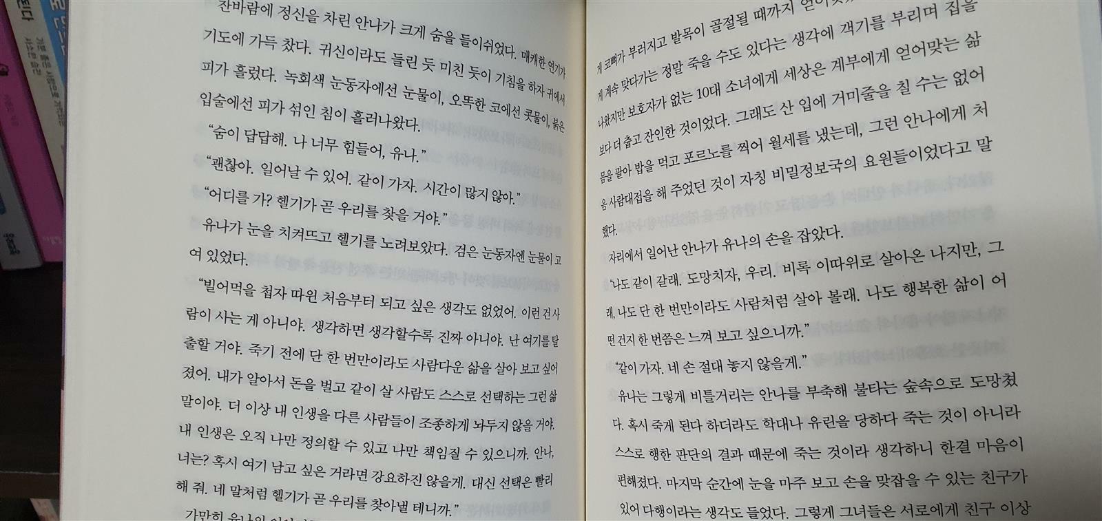 이 책은 다빈치남을 쫒아가면서 베이루트와 로마 등으로 이야기의 배경이 옮겨다니다가 우연치 않게 사막에서 닥터브라운의 흔적을 발견하게 되면서 이야기가 급격하게 진행됩니다. 또한, 유나는 공항에서 우연히 마주친 아주 먼 과거 북한에서 자신을 폭행하고 가학적으로 괴롭혔던 군인을 만나게 되면서 또 이야기가 전환됩니다. 처음에는 단순히 닥터브라운의 보물을 찾는 이야기라고 생각하지만 이야기는 마치 3x3 큐브퍼즐이 제멋대로 돌다가 하나의 색깔로 맞춰지듯이 조각조각 합쳐집니다. 닥터브라운의 보물, 다빈치남의 그림, 유나의 과거, 안나와 작은새들 하나씩 모여면서 그림이 그려집니다. 이렇게 이야기가 전환되고 펼쳐지는 무대는 북한에서 시작해서 베이루트와 로마, 남한 등 전세계를 돌아다니며 그려지는데 마치 미션임파서블과 같은 국제 스파이 영화의 스토리라인을 보는 듯 한 생각도 듭니다. 물론 유나가 이단헌트와 같은 액션배우가 아니며 장르가 다르기 때문에 스펙타클한 면은 다르지만 스토리의 빠른 전개와 치밀한 심리묘사는 상당히 흡입력이 높고 예상치못하는 이야기의 흐름이 재미있습니다.