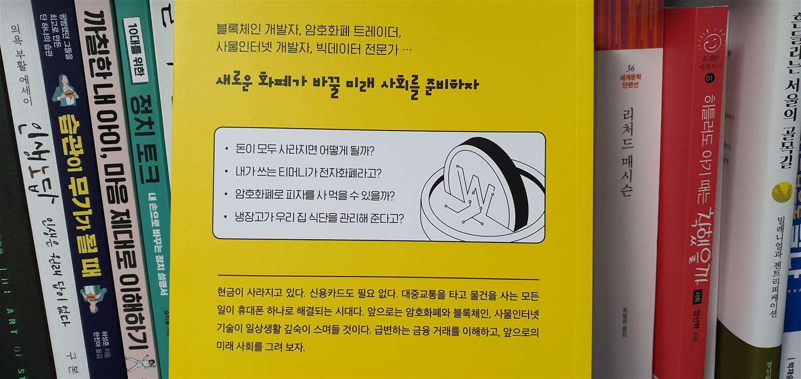 비트코인으로 대표되는 가상화폐/암호화폐는 실생활에서 직접 사용이 가능한 수준까지 확산되었고 다양한 분야에서 가상화폐의 적용사례가 증가하고 있습니다. 가상화폐가 등장하기 전까지는 현금없는 사회가 언급되었지만 지금은 현금을 넘어서 카드없는 사회까지 언급되고 있습니다. 불과 십여년 전까지만 해도 가상화폐는 이렇게 중요하게 거래되지 않았고 불과 삼십년 전까지만 해도 현금은 필수불가결한 거래수단이었습니다. 그렇다면 십년후에는 어떤 세상이 올지 아무도 예측하기 어렵지 않을까 싶습니다. 이러한 화폐가 없는 세상이 다가오는 발전과 역사의 이야기를 청소년이 이해할 수 있는 쉬운 이야기로 풀어낸 책이 나왔습니다 "이 세상의 모든 돈이 사라진다면" 이라는 책은 제목 그래도 옛날에는 존재했던 화폐의 유형이 상당히 달라지고 있으며 조만간 화폐의 개념이 급변할 것 이라는 내용을 담고 있으며 그 역사를 조개화폐부터 비트코인까지 정리하고 있습니다. 이 책의 독자는 중고등학생을 위한 타겟으로 잡혀있기 때문에 각 챕터마다 진로탐색을 위한 직업도 소개하고 있는 점이 장점입니다.