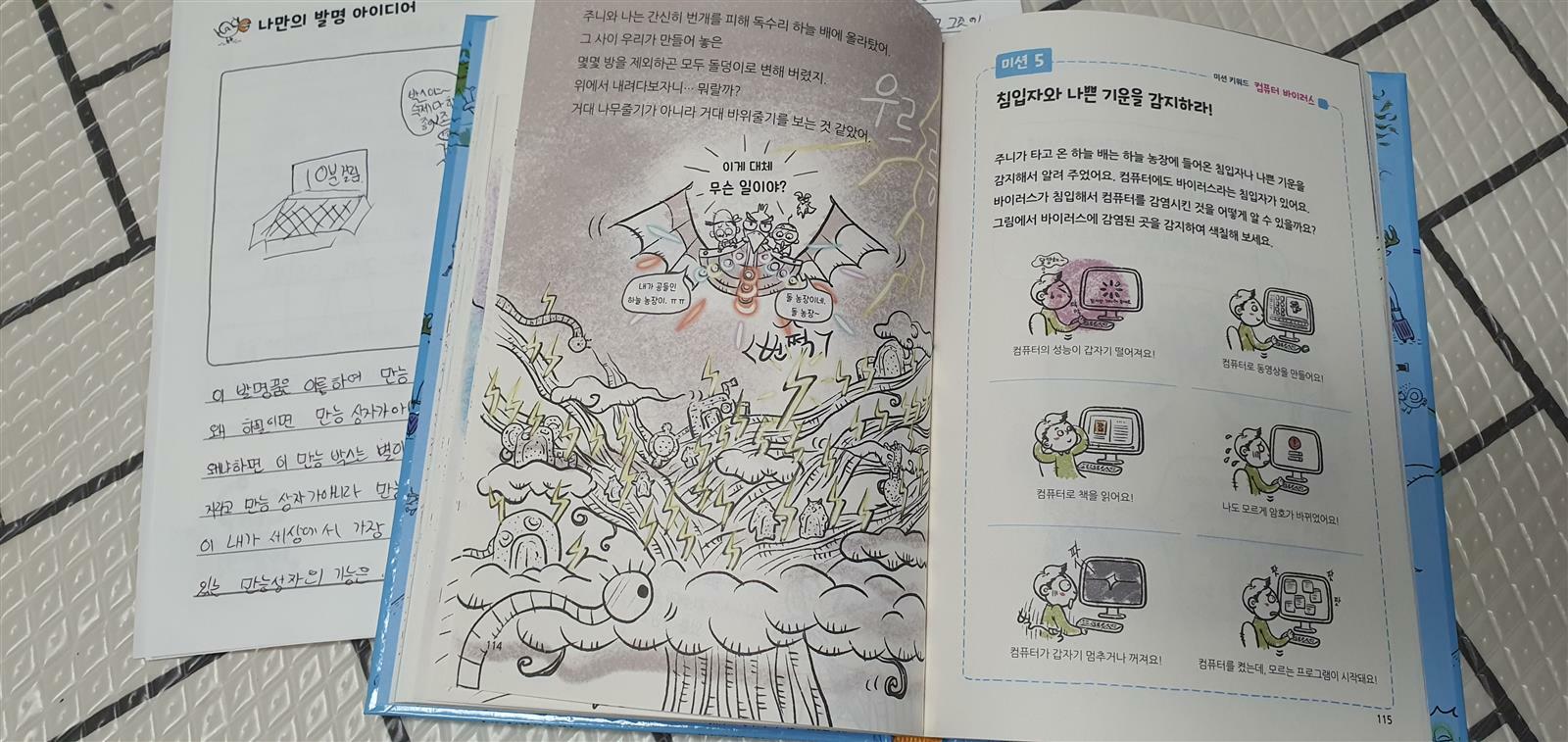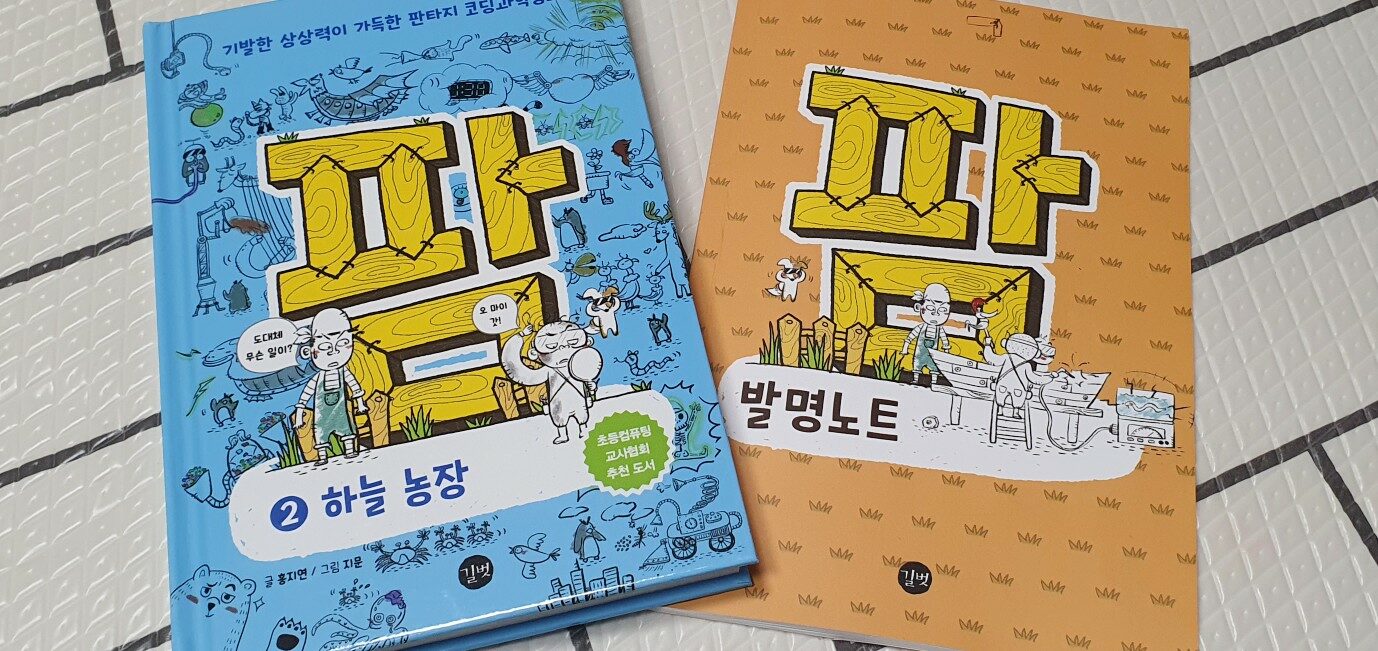 팜시리즈가 주목받는 이유는 재미와 이론교육 두가지를 모두 잡았기 때문입니다. 팜2권에서는 주니 거니의 활약상을 통해서 몇 가지 코딩이론이 소개됩니다. 특히 바이러스로 표현되는 번개가 하늘농장을 파괴하고 동물들을 돌로 만드는 과정에서 바이러스의 개념이 소개됩니다. 그리고 번개를 해치우는 과정에서 랜덤수, 네트워크의 개념이 소개됩니다. 해치운 번개를 멀리 내버리는 과정에서는 좌표평면과 위치의 개념, 무작위수의 개념 등이 소개됩니다. 이렇게 코딩이론이 소개될 때에는 구구절절 이론으로 설명하는 것이 아니라 주니 거니의 발명품과 그 두 명의 활약상을 동화로 보면서 이해하게 됩니다. 그리고 각 챕터의 말미에 보다 상세하게 부가설명과 사진이 포함되어 있으므로 이 부분을 부모가 활용할 여지가 있는 것도 좋습니다.