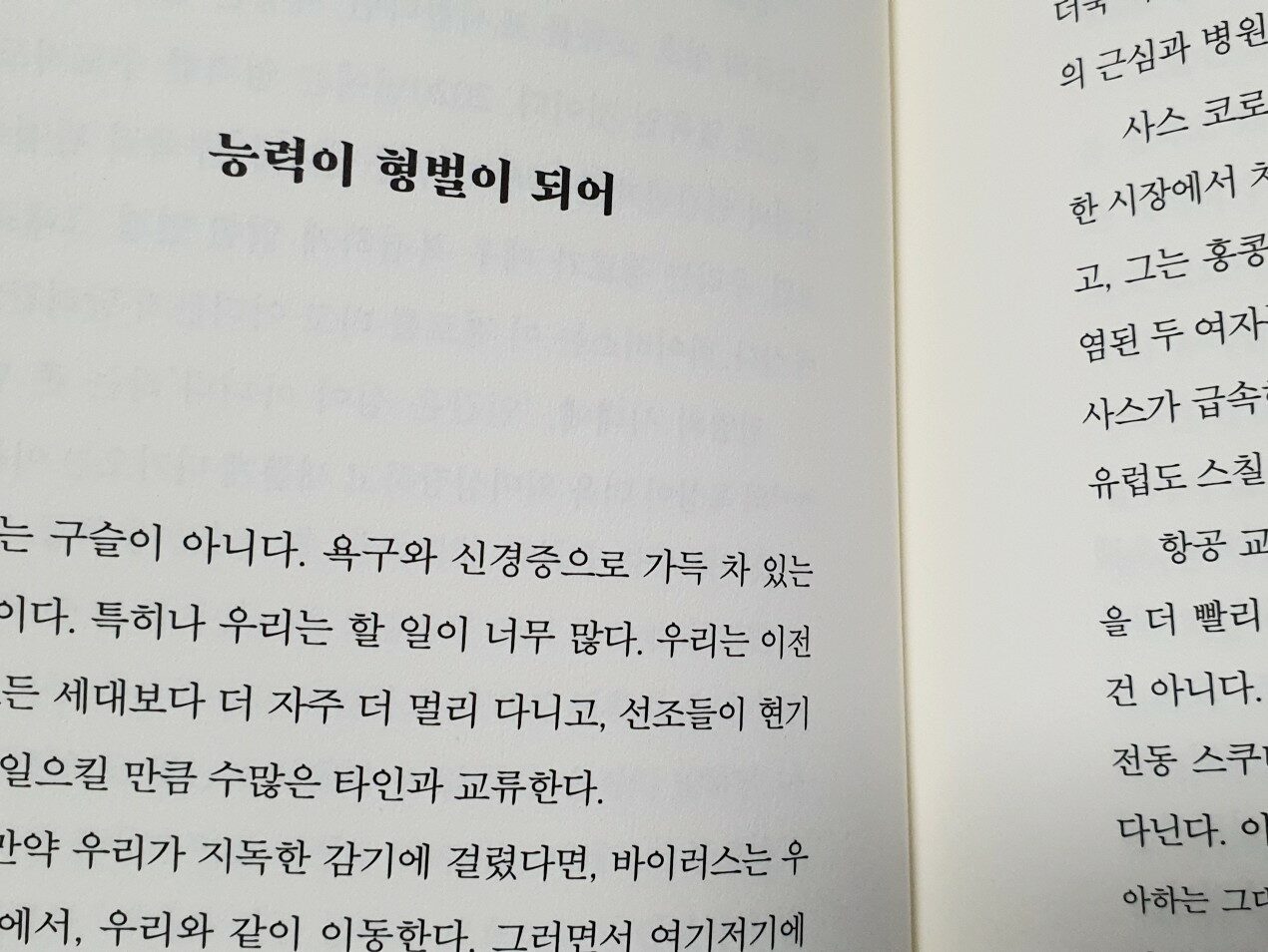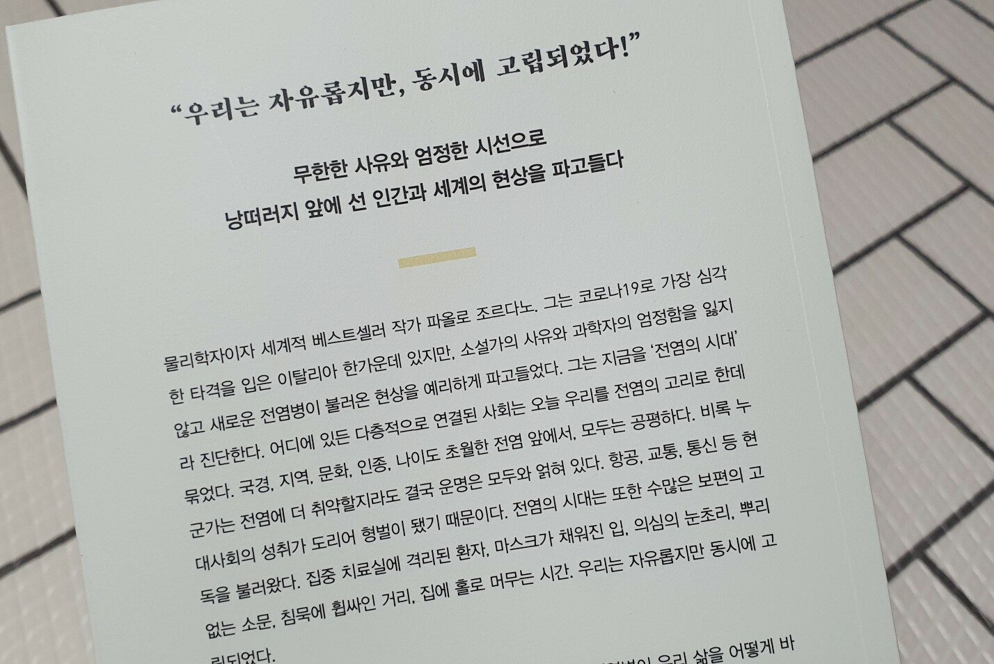 전 인류를 구슬로 표현한다면 하나의 구슬이 움직이면 파도처럼 모든 구슬이 튕겨져서 기하급수적으로 영향을 미칩니다. 인간이 구슬과 다른 점은 스스로 움직이고 거리를 벌리며 문제를 해결할 수 있다는 점일테니, 인간은 전염병에 맞서 스스로 사회적 거리를 두고 구슬간의 간격을 벌려야 합니다. 이탈리아에서 나온 베스트셀러 작가의 에세이에 담겨있는 소망과 기대는 2020년 4월 대한민국에서 진행되는 코로나19 대응책을 설명하는 것 같아서 자부심과 뿌듯함이 느껴지는 것도 사실입니다.