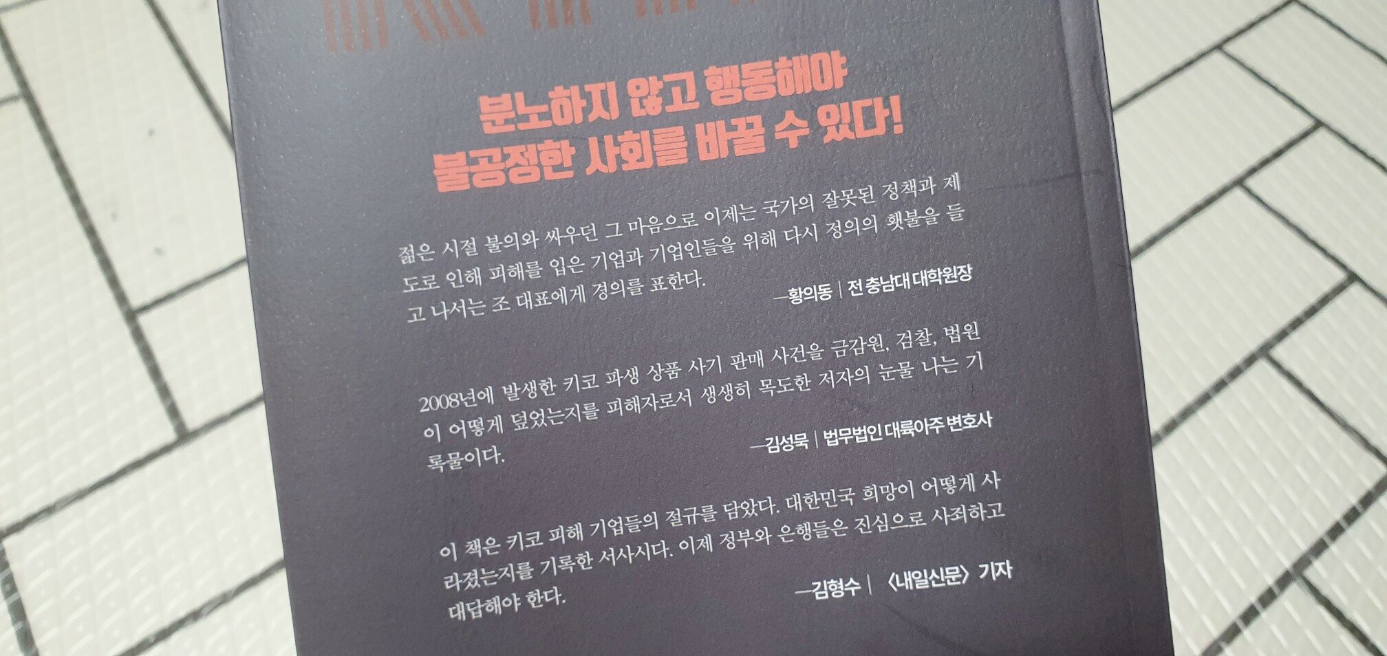 2008년 미국의 서브프라임모기지론과 파생상품들에 의해 발생했던 글로벌 금융위기 그리고 리먼브라더스사태는 예측할 수 없었던 외부적인 불가피한 상황이었다고, 판단되었습니다. 그리고 키코상품의 불공정함은 인정되지 않았으며, 키코상품의 계약조건에 문제는 없었다고 해석됐고, 단지 글로벌금융위기라는 불가피한 상황때문에 우연이 어쩔수 없이 그렇게 된 것이라고 결론이 되었습니다. 억울한 수십 수백개의 중소기업 피해자만 존재하고 가해자는 없으면서 수조원의 피해를 끼친 키코사태에서 은행은 엄청난 반사이익을 얻었습니다. 이 책을 통해 느끼는 것은 키코사태가 아직 끝나지 않았고 이름만 바뀐 새로운 키코상품들이 시장에 움직이고 있다는 것입니다 2019년 라임자산운용, 라임사태도 상당히 유사한 면이 있는데 피해자에 대한 구제가 원할하게 될지도 의문입니다. 키코사태가 발생한지 십년이 넘었지만 아직까지 피해기업들과 피해자들은 밤 잠을 이루지 못하고 있습니다. 조속히 피해복구와 사과, 원인규명 등 결자해지의 결론이 나오기를 바랍니다