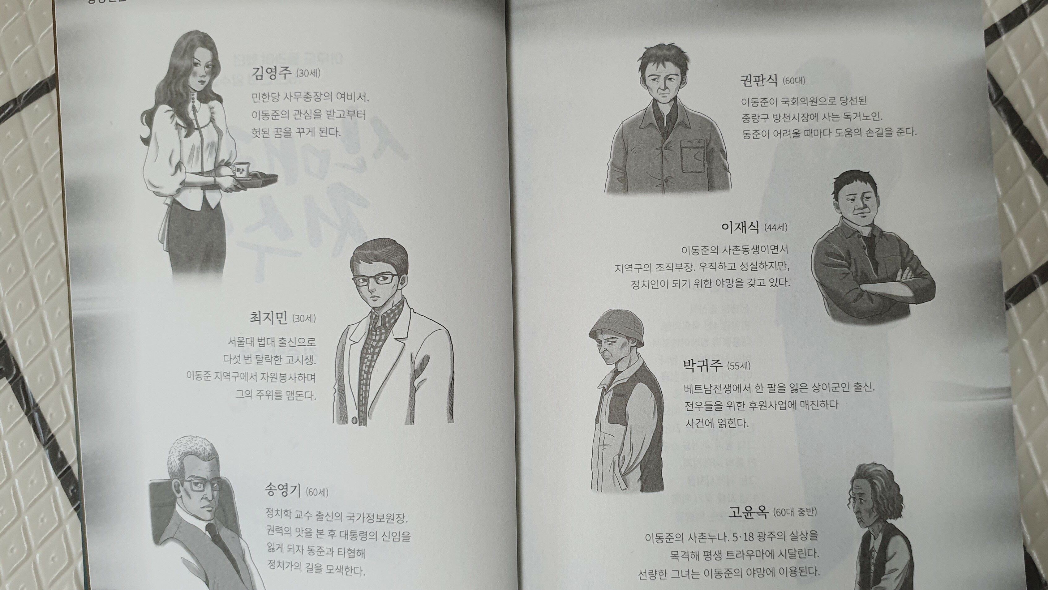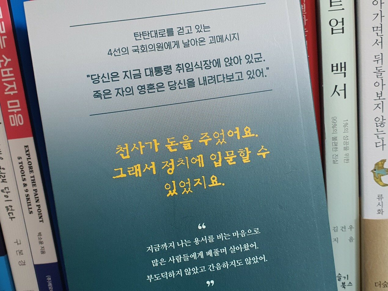 이동준을 둘러싼 인물들은 다양하게 등장합니다. 신임대통령, 이동준의 조직부장 이재식, 이재식의 사촌이자 법대출신의 최지민, 이동준의 비서이며 소비욕이 강한 김영주, 국가정보원장이자 이동준의 뒤를 캐는 송영기, 이동준의 사촌누나인 고윤옥, 과거부터 이동준을 도왔던 권판식 등이 등장합니다. 이들 중에 누군가는 이동준의 암수살인의 목격자일 것이고 지금 문자를 보내 협박하는 사람일 것이며 이동준을 위협하는 사림인데 그를 찾고 해메이는 과정이 게속됩니다. 책의 최종장에서 암수살인의 피해자와 살인자, 목격자가 누구인지 밝혀지고 이동준이 받는 천사의 돈의 출처가 밝혀지므로 마지막 스무장을 남겨놓을때까지 페이지를 멈추지 못하게 합니다. 오랜만에 재미있게 읽은 국내 암수살인 소설이자 페이지터너입니다.