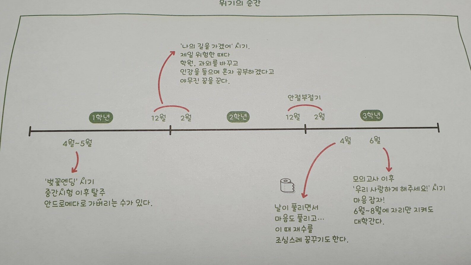 이 책의 저자이자 고등학생의 학습멘토는 고등학생에게는 라인이 두 개 있다고 합니다. 첫번째 라인은 수능공부를 하지 않는 시간인데 이 시간에는 내신을 준비하는 시간입니다. 두 번째의 라인은 수능공부를 하는 라인이고 이 시간에는 수능만을 집중적으로 준비합니다. 저자는 하나의 챕터를 크게 할애하여 두 개의 라인을 정의하고 각 라인의 시간을 효율적으로 분배하고 집중하며 효과적으로 운영하는 기술을 알려줍니다. 이 굴에는 단지 열심히 공부해라 같은 정성적인 이야기가 아니라 구체적인 기법과 시간배분 요령, 학습법, 암기법, 스케줄관리법, 도구사용법까지 실질적이고 정량적으로 표현해주고 있습니다. 따라서 고등학교 3학년이 될 학생들이라면 자신에게 부족한 라인을 어떻게 보완해야할 지 해답을 찾을 수 있습니다