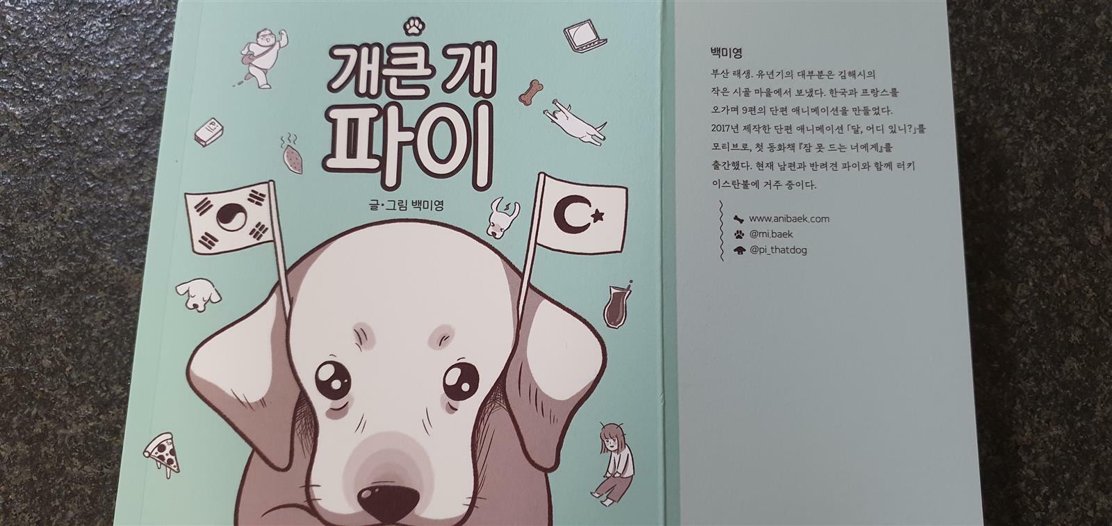 백작가님이 개큰 개 "파이"를 만나게 된 것은 익박사님과 연애를 하면서 부터니까 처음에는 "남의개"로 만나게 됐어요. 남의개를 보는 것과 우리개가 되서 직접 키우는 것은 참 다르겠죠. 이 책에는 파이를 만나고 키우면서 생긴 다양한 에피소드가 담겨 있어요. 특히 가장 큰 문제였던 것은 결혼하자마자 ( 이 말은 파이와 함께 살게 되자마자 ) 겨우 6개월 만에 먼 타국인 터키로 이사하게 되었기 때문이에요. 파이 똥 치우는 것도 어색하던 저자는, 35kg이나 되는 파이를 어떻게 데리고 터키까지 갈지 그 이후에는 어떻게 할지 고민을 많이 했데요.