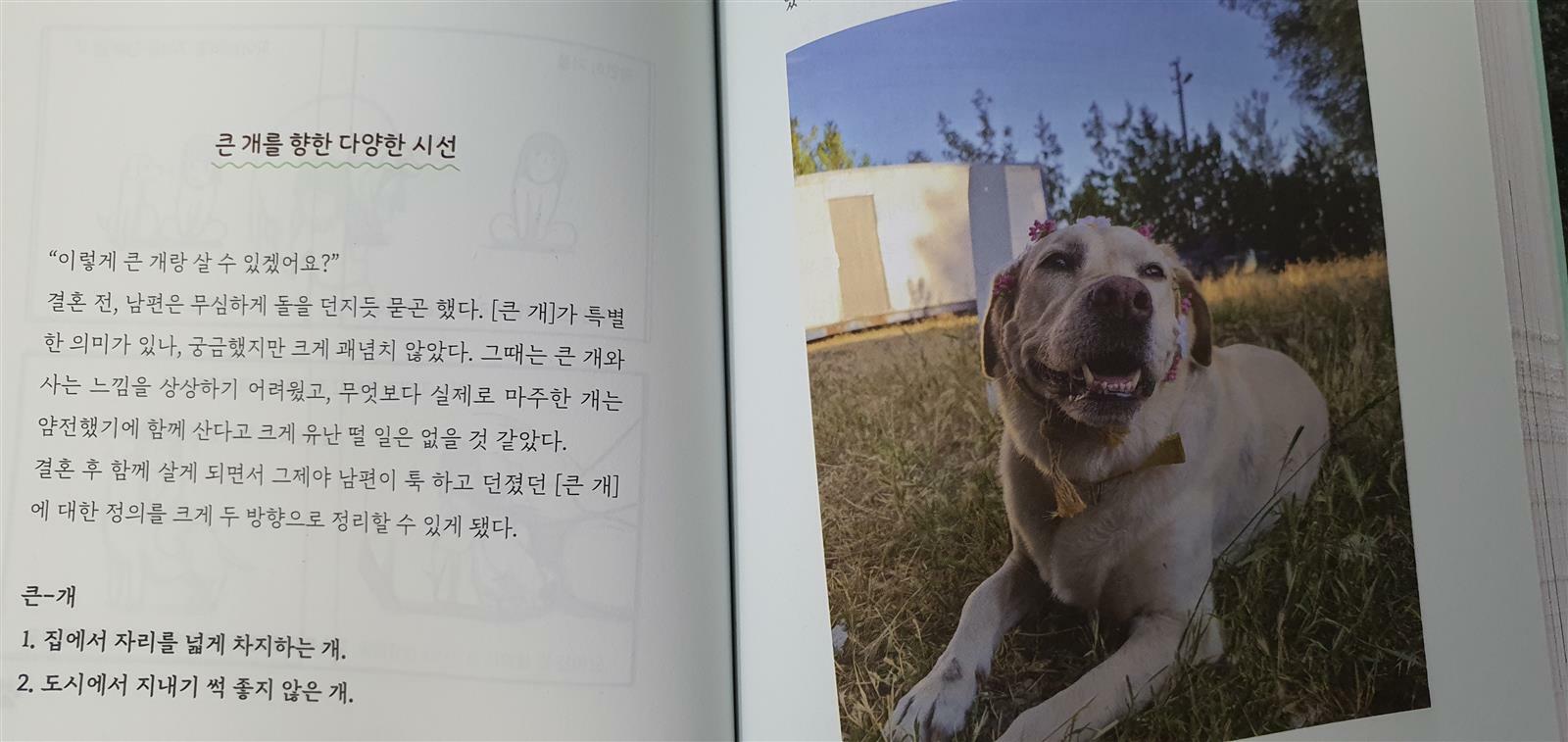 <개큰 개 파이>라는 제목은 생각해보면 참 재미있어요. "개"라는 명사가 굉장하고 엄청나다는 형용사로 쓰이는 표현을 큰 개를 키우는 견주가 직접 골랐으니 말이에요. "파이"는 리트리버 종의 커다란 개이고 이 책의 저자인 백작가(백미영)님이 키우는 반려견이기도 해요. 백작가님은 원래부터 견주는 아니었고 짝사랑, 첫사랑, 끝사랑인 지금의 남편분 익박사님과 결혼하면서부터 본격적인 견주가 됐어요.