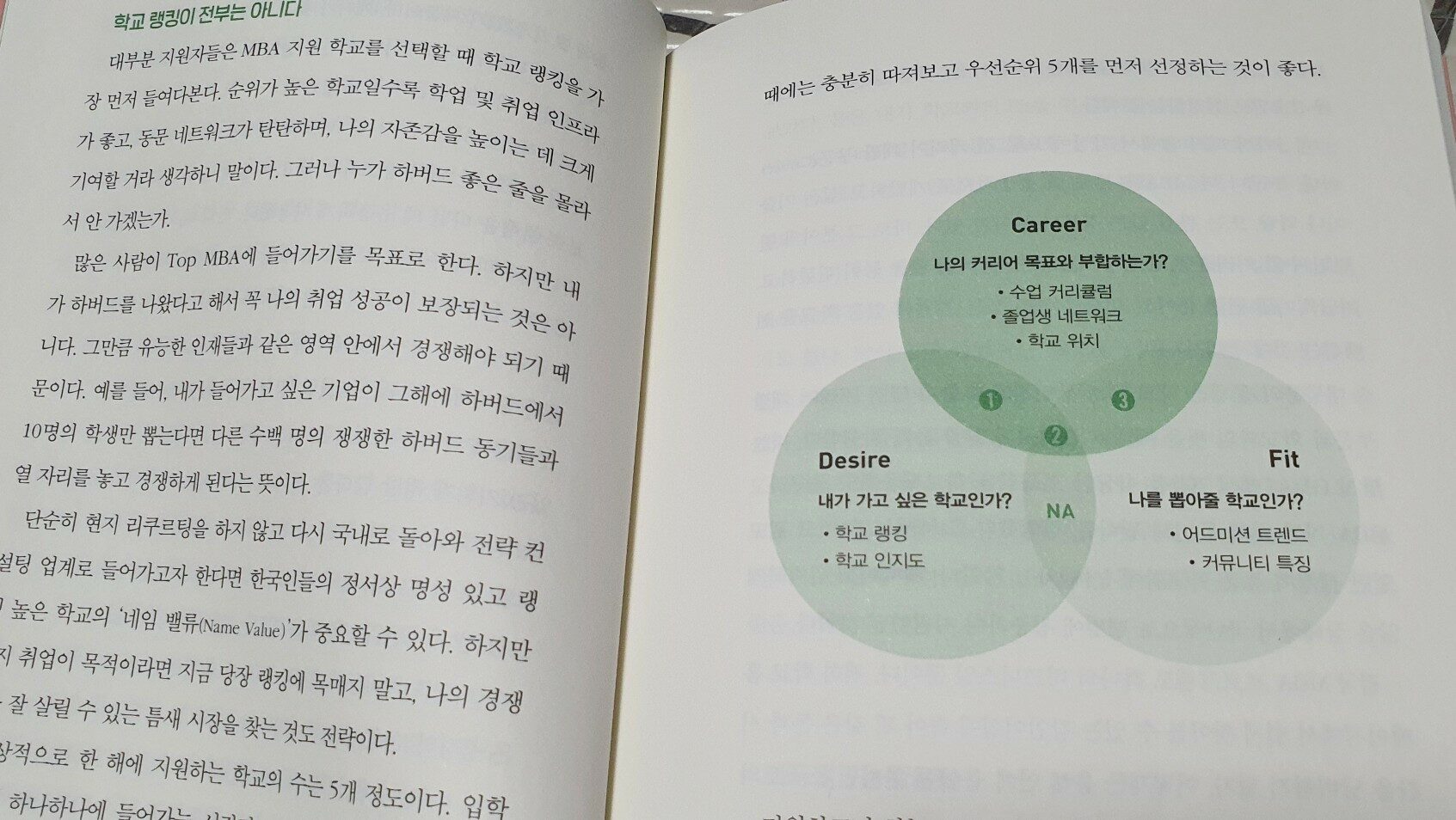 해외 MBA를 지원할 때 첫 번째는 어떤 학교를 선택할지 고민인데, TOP 100 대학중에서 미국이 51%, 유럽이 26%, 아시아에 17%가 있다고 하니까 대부분 미국을 목표로 할 것 같아요. 미국의 M7인 상위 7개 학교와 T16이라고 불리는 M7을 포함한 상위 16개 학교를 알고 있다면 최상위 MBA를 지원하는 데 도움이 될 거에요. 미국 아이비리그 학교는 대부분 북서부에 집중되어 있으니 지역적으로도 고려해볼 수 있고, 뉴욕에 있는 학교를 선택하면 회사와 네트워킹이 유연하다는 장점도 있어요. 이 책에는 그저 랭킹이 전부가 아니라는 현실적 조언이 담겨 있으므로 이 부분은 반드시 읽어봐야 겠어요.
