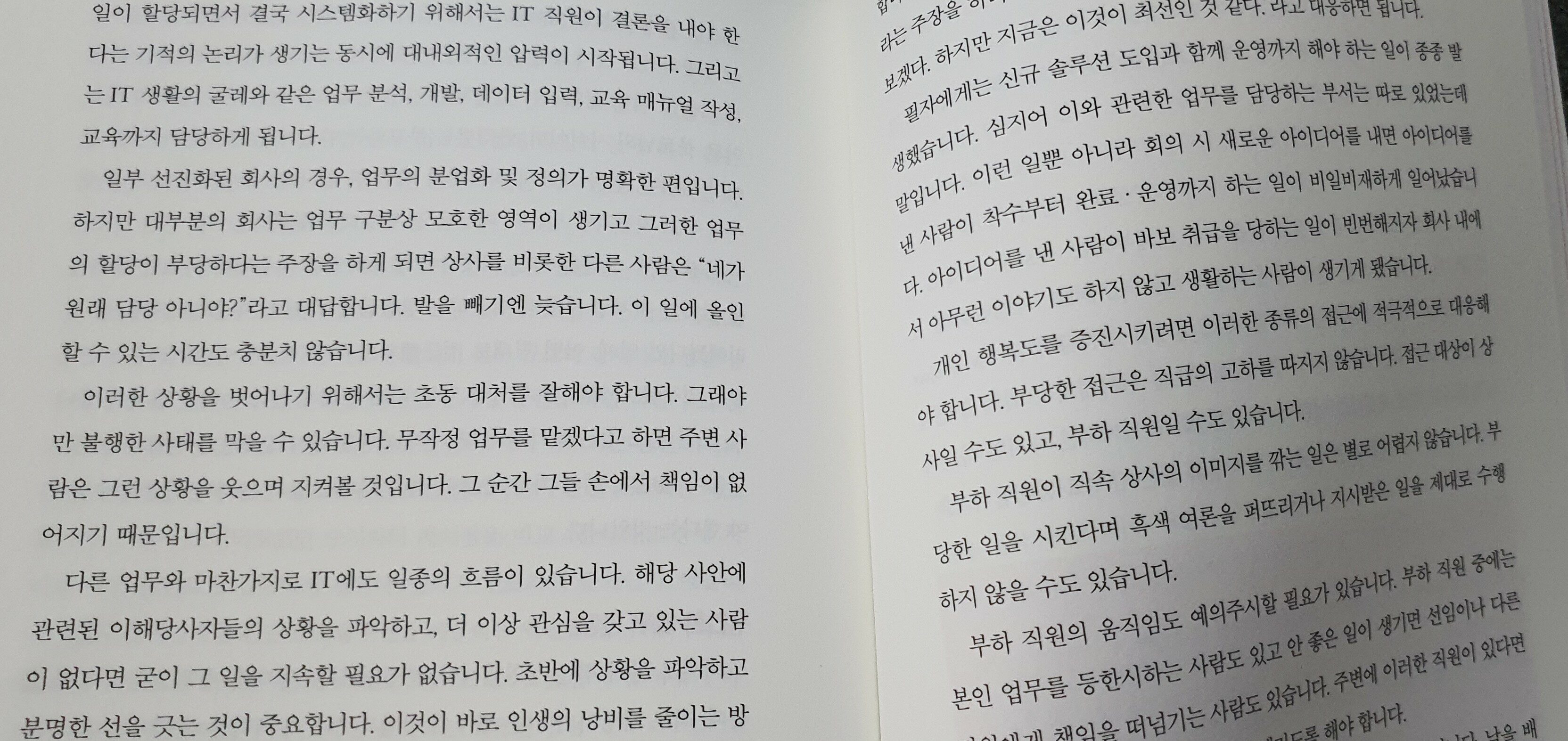 IT업계는 말도 못하게 많은 직군과 업종이 혼재되어 있는 다양성의 집합소입니다만, 크게 몇 가지 대표적인 업무로 나누어 볼 수도 있습니다. 우선 개발자라고 불리는 IT 프로그래머가 있고 IT 운영업무와 기획업무로 크게 나눌 수 있습니다. 또한, 잘 알려져 있지 않지만 IT 헬프데스크의 1선처리 담당자들은 굉장한 고생과 노력끝에 서비스의 품질을 책임지고 있습니다. IT 헬프데스크는 단순하게는 사용자의 노트북이나 데스크탑 환경의 오류에 대해 접수하여 처리하고 고객의 문제를 해결하는 업무로 시작하기도 합니다. 또한 기업의 데이터베이스의 주요 데이터를 조회하고 삭제 및 수정하는 업무나 재고 자산을 다루는 업무를 하기도 하며 ITSM 이라 불리는 라이프 사이클 관리 프로세스에 따라 업무를 수행합니다. IT 업계에서 꽃이라고 불리는 두 가지 직업을 꼽는다면 단연코 프로그래머와 IT 운영자를 선택해보겠습니다. JAVA, C, 파이썬, C++, 닷넷 등 수 많은 언어들을 이용하여 고객의 요구사항을 그 어떤 형태로든 창조하는 프로그래머는 이 업계의 대표직군이고 이 책에서도 저자의 말을 통해 많은 꿀팁을 담아내었습니다. 그리고 프로그래머 꽃이라면 IT운영은 열매와 같아서 기획자와 함께 시스템과 서비스를 최고의 품질로 제공하고자 노력합니다. IT 프로그래머와 운영자, 기획자, 헬프데스크 담당자들은 ITSM ( Information Technology System Management) 라고 불리는 절차 및 프로세스에 의해서 움직입니다. 책에서는 단순히 이 업계에서 인정받기 위해 꿀팁 이상으로 예산관리부터 ITSM 수행에 까지 이르는 실무적인 내용들을 많이 소개하고 있습니다. 제 생각에는 IT에 취업하고 싶은 취준생들에게는 필독서라고 보입니다. 출판사로부터 제공받고 솔직하게 쓴 글입니다