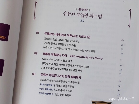 #왕초보유튜브부업왕 은 이름처럼 왕초보의 눈높이에서 가볍게 시작하는 방법을 제시한다. 목차부터 꼼꼼하고 상세하다.