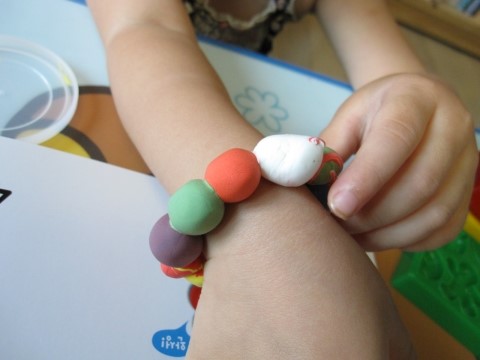 기본색으로 하늘색, 주황색, 초록색, 분홍색 등 여러 색을 만들어 알록달록 팔찌를 완성했어요.